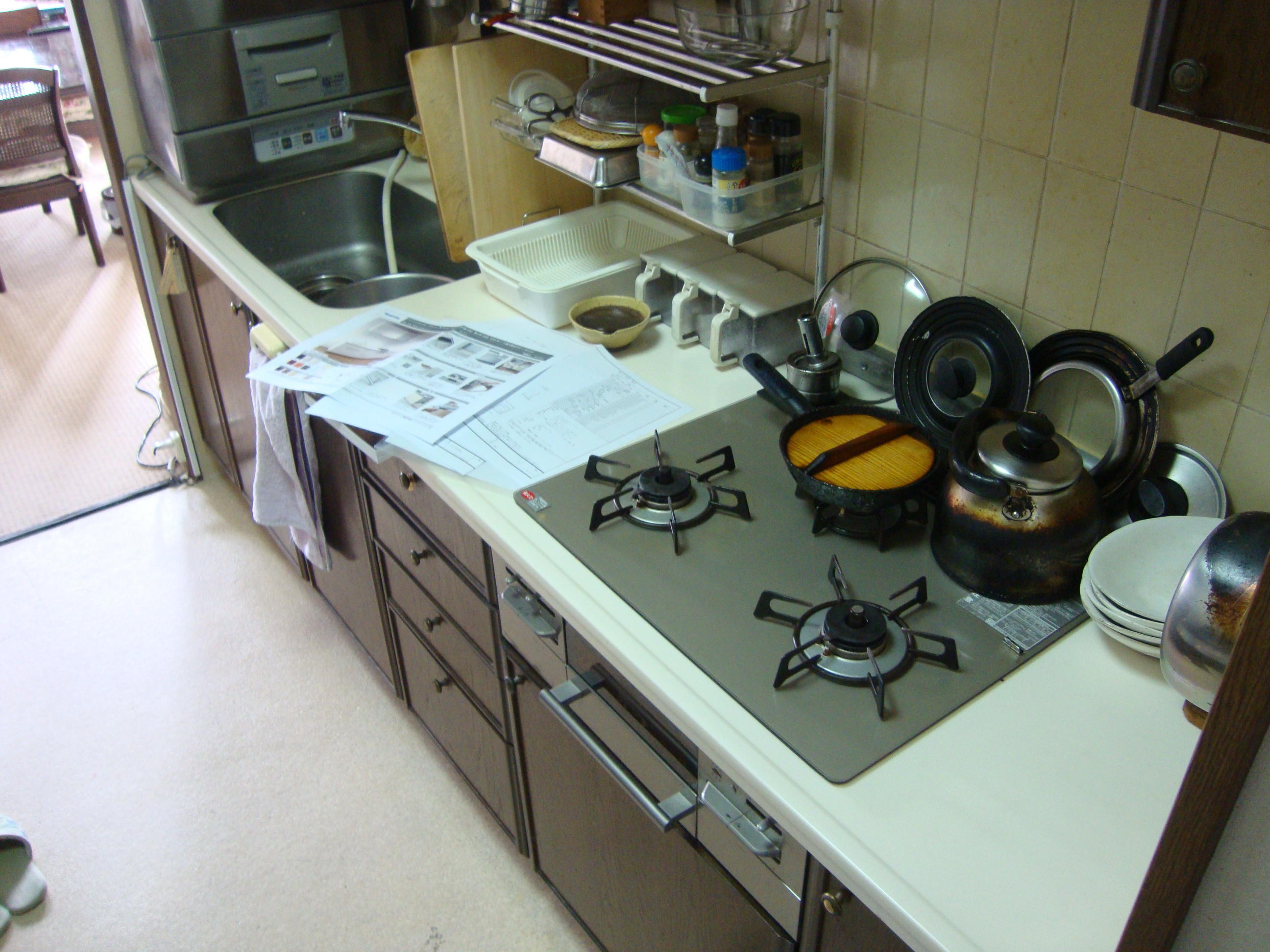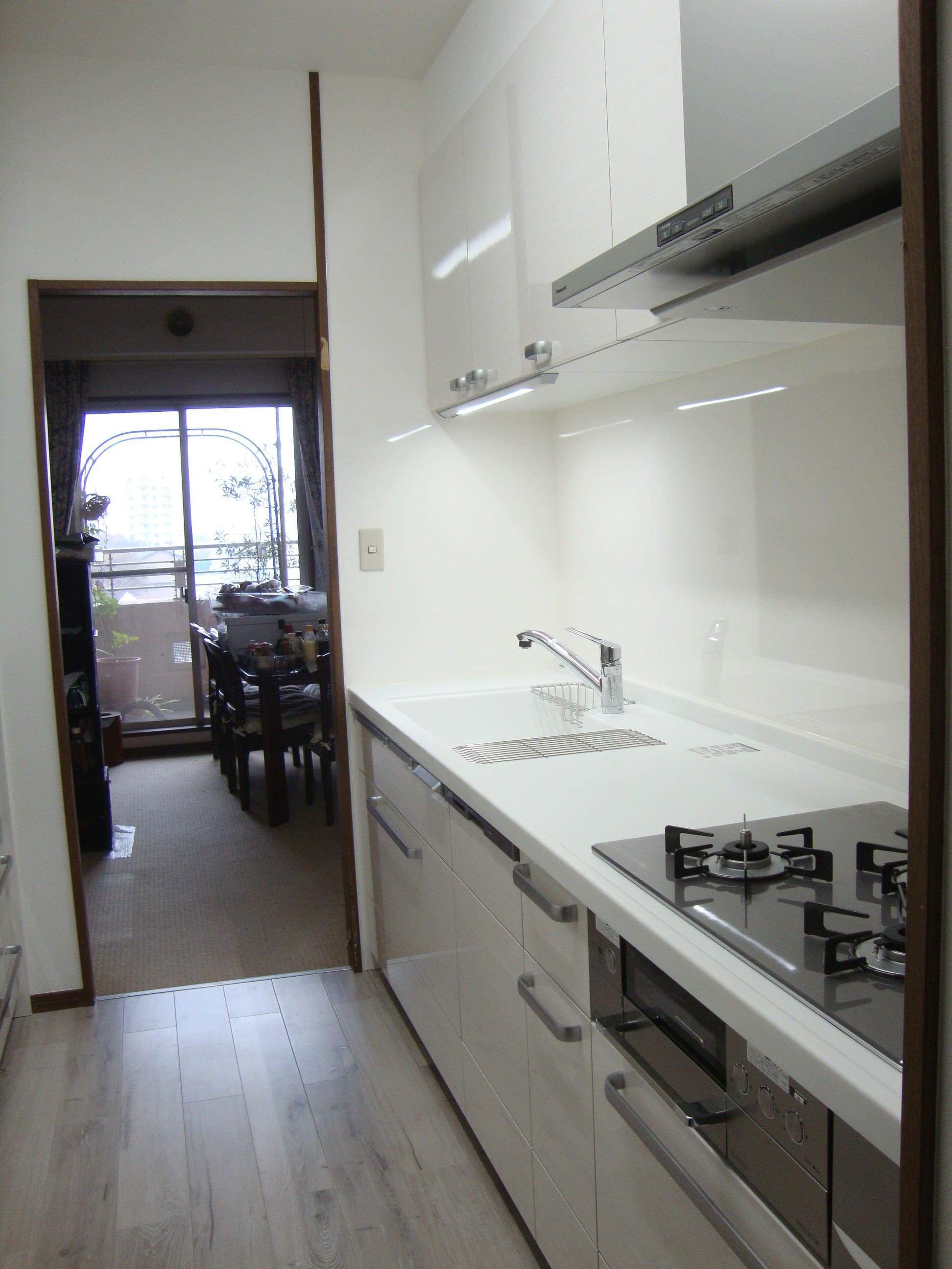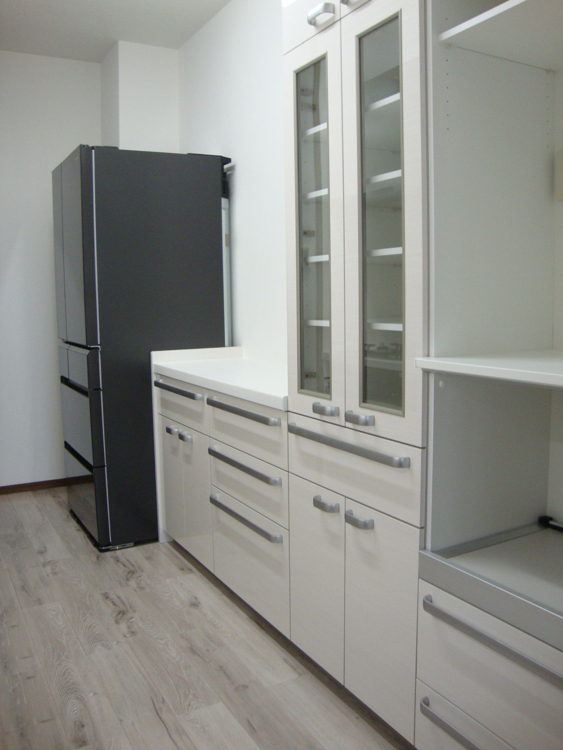 白を基調とした明るいイメージのキッチンになりました!背面にも新たに食器棚を設置し、ごちゃごちゃしていたスペースが綺麗にまとまりました♪