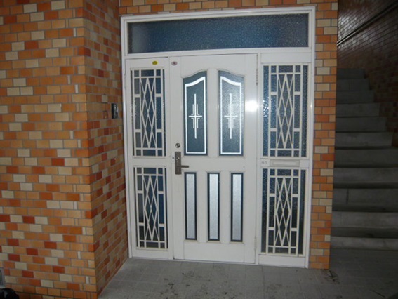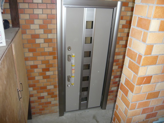 カバー工法で玄関を1dayリフォーム。リシェントへ玄関交換。色は白からシャイングレーに、鍵も簡易タッチキーシステムへ、玄関高さもランマ無しにし高くなり、玄関戸の重厚感も増す。同時に勝手口の交換も行う。