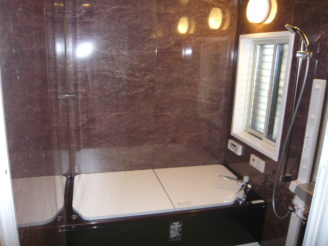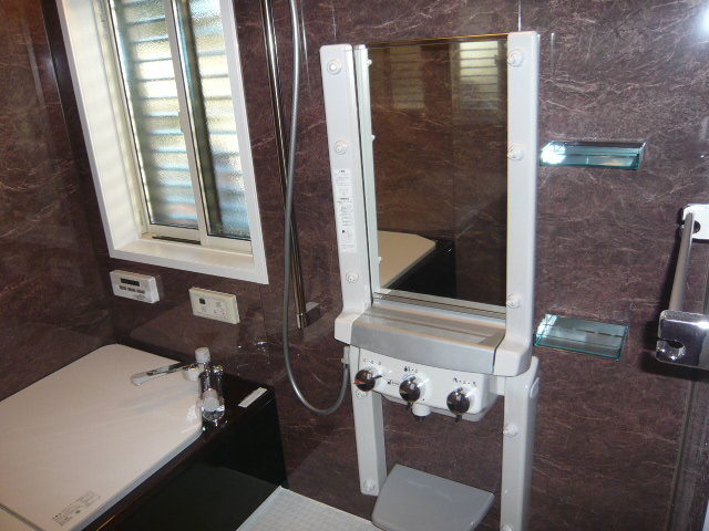浴槽は人造大理石のクレアパールのゴールドブラウンで、浴室壁面は全面Lパネル鏡面、シャワーをオプションでシャワードバス、入り口部分を片引き戸インテリアタイプを選択し、すべて細かいオプションをメッキにし、高級感あふれる浴室に仕上げることが出来ました。