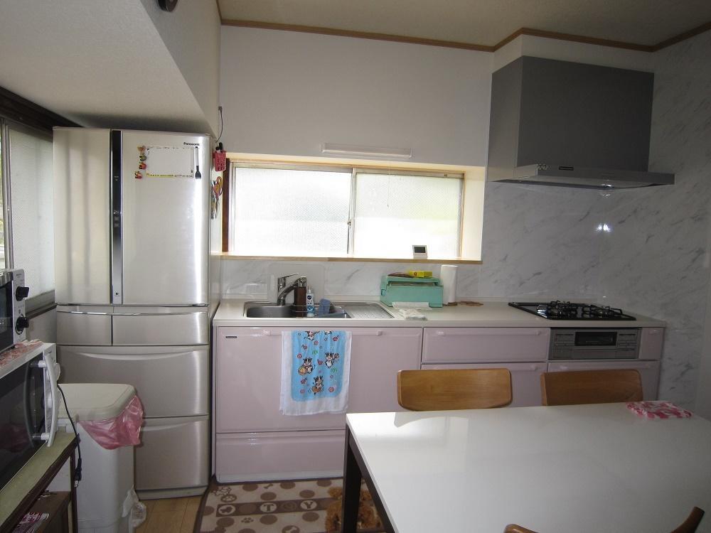 使いやすく収納スペースが大きいキッチンに取替て、冷蔵庫を同じ並びかえました。 床は重ね張りをして廊下との段差解消しました。壁にキッチンパネルを貼り、お掃除が楽になりました。