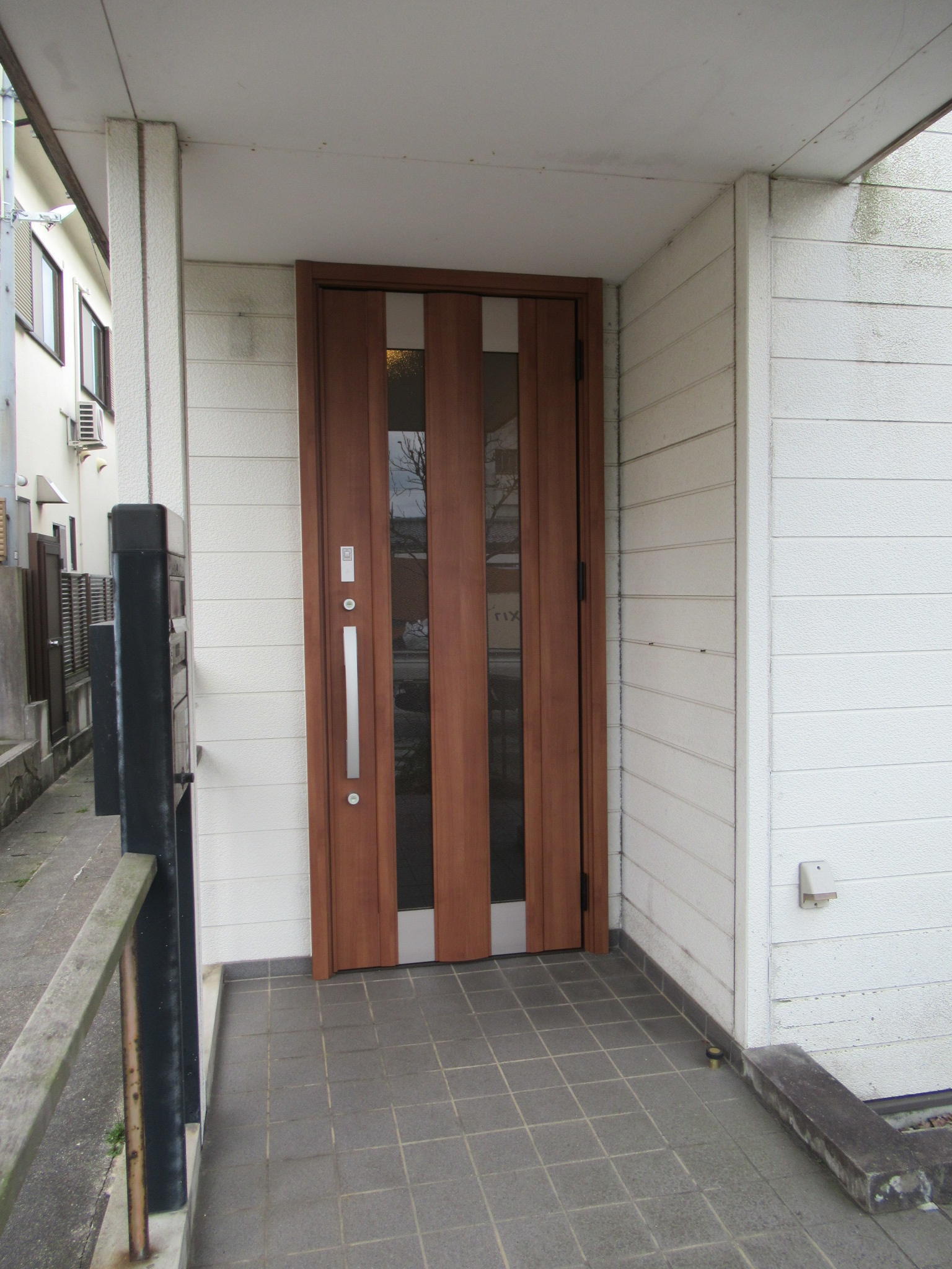 永年県外にてお過ごしのご夫婦のH様。定年を機に松江に帰って来れることに・・・。一番に気になったのが玄関でした。木製の玄関ドアでしたが、経年劣化によりかなり古くなっております。そこで1DAYリフォームのLIXILのリシェント玄関ドアにお取替えさせていただきました。木目調がお好みでしたので、 C14型 ミディアムチェリーにて。簡単操作のタッチキーもご採用されました。イメージを決めるのに、LIXILリシェント玄関ドアには豊富なカラーバリエーションが人気です。表通りに面したお家でしたので見た目も変わりとても満足と言っていただきました。