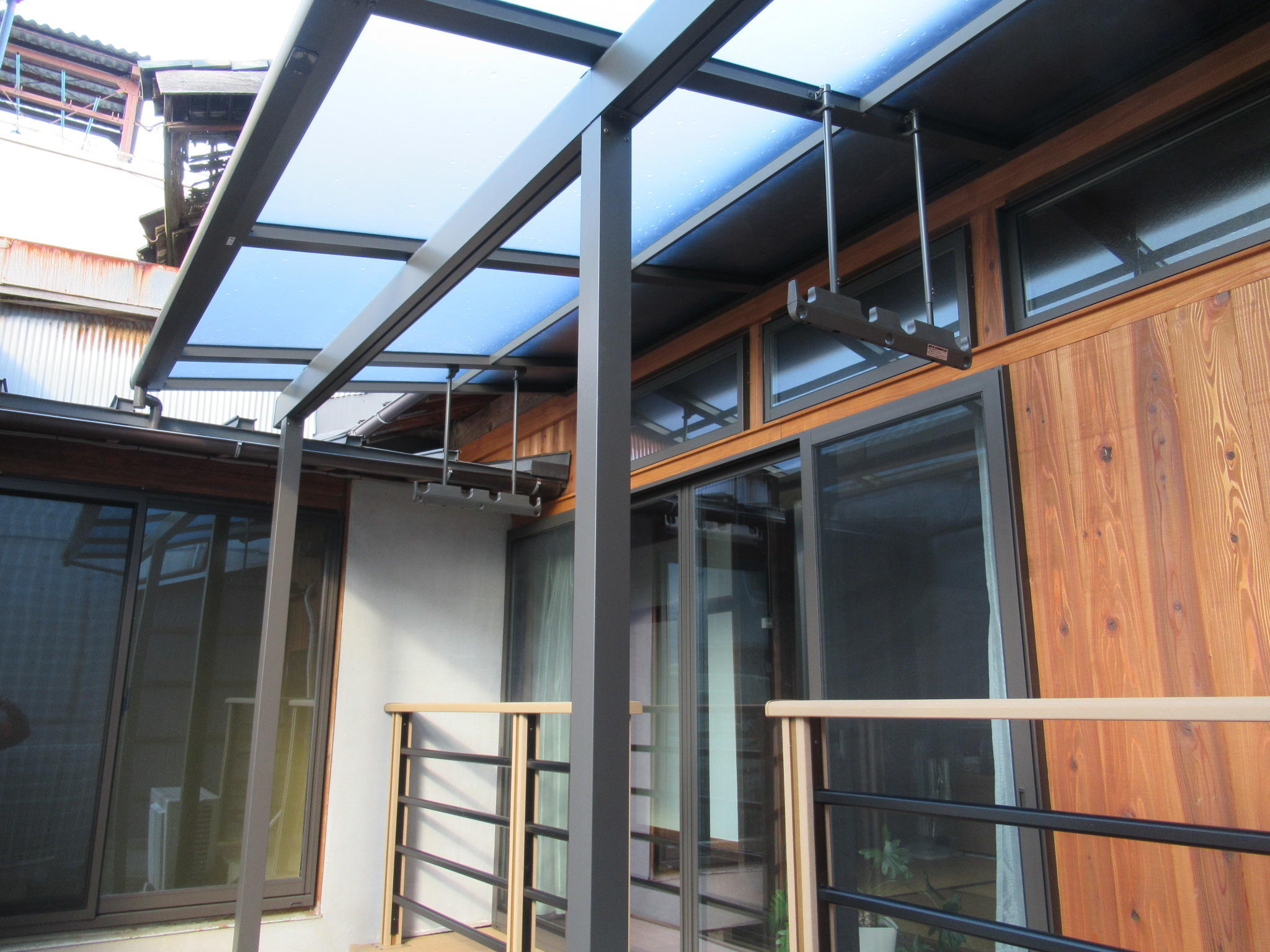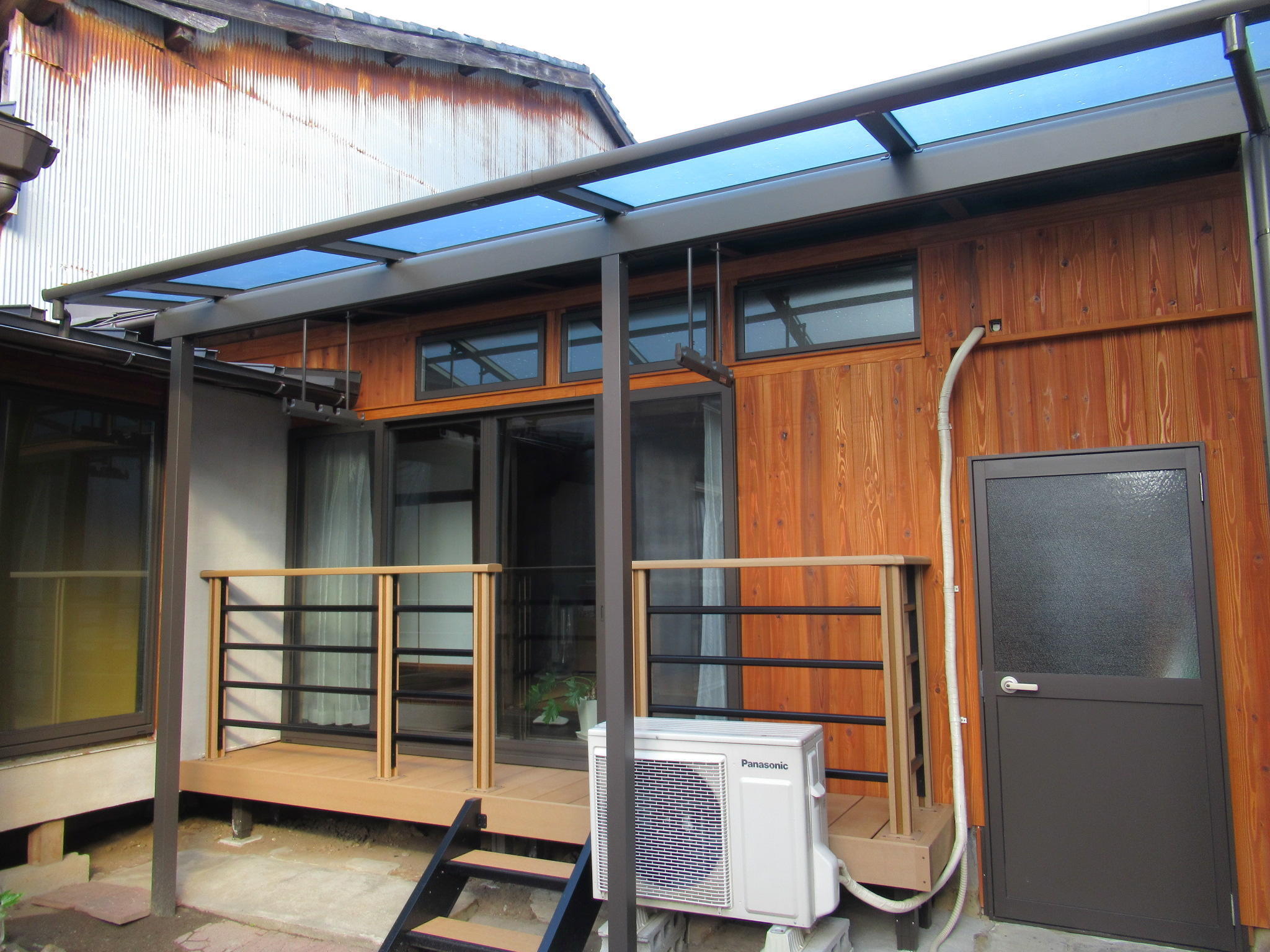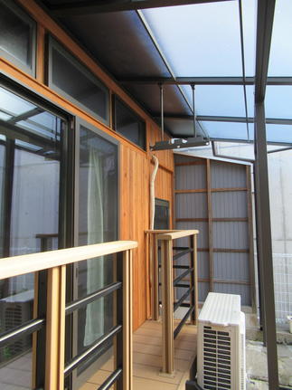 サッシ:LIXIL サーモスL ランマFIX テラス:LIXIL スピーネF型 自在桁、屋根熱線吸収ポリカ ウッドデッキ:LIXIL 樹ら楽ステージ ステップ2段 フェンス
