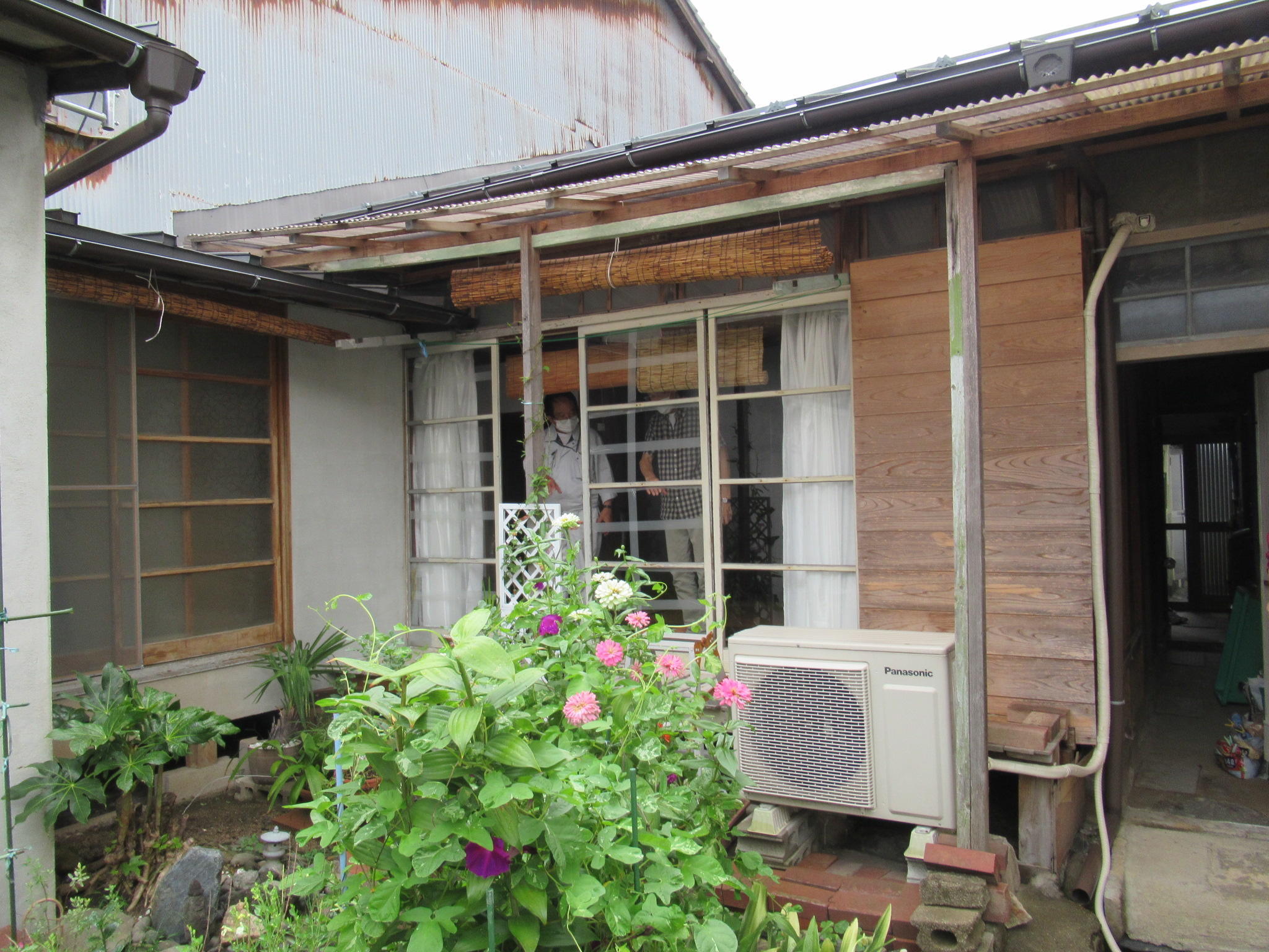 中庭に面した縁側サッシ。木製でしたので隙間風と断熱性が心配とのご相談を受けました。窓廻りは建具やデッキ、テラスと勝手口すべて木製部分を撤去しました。 壁の張替、塗装で完了です。