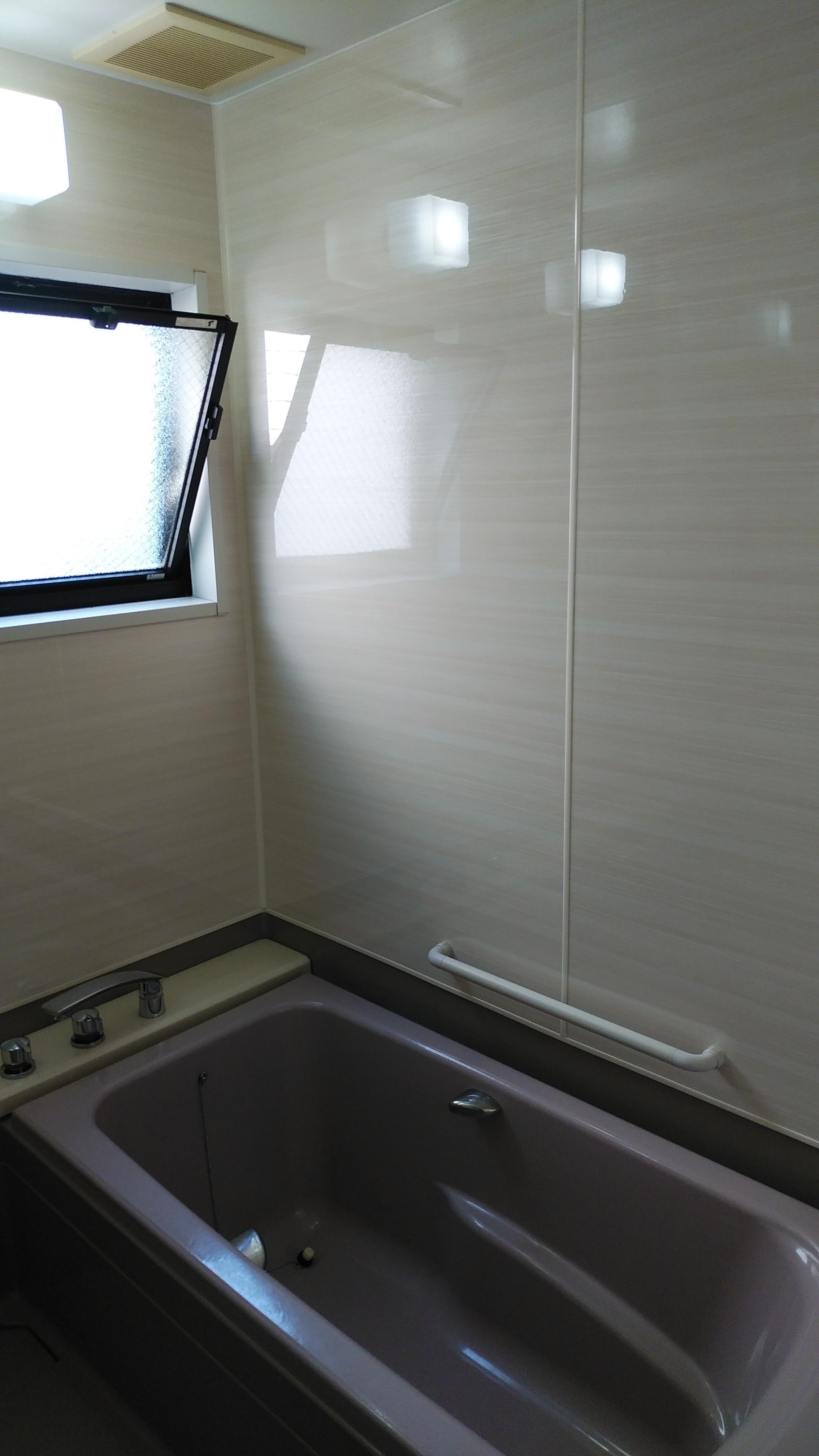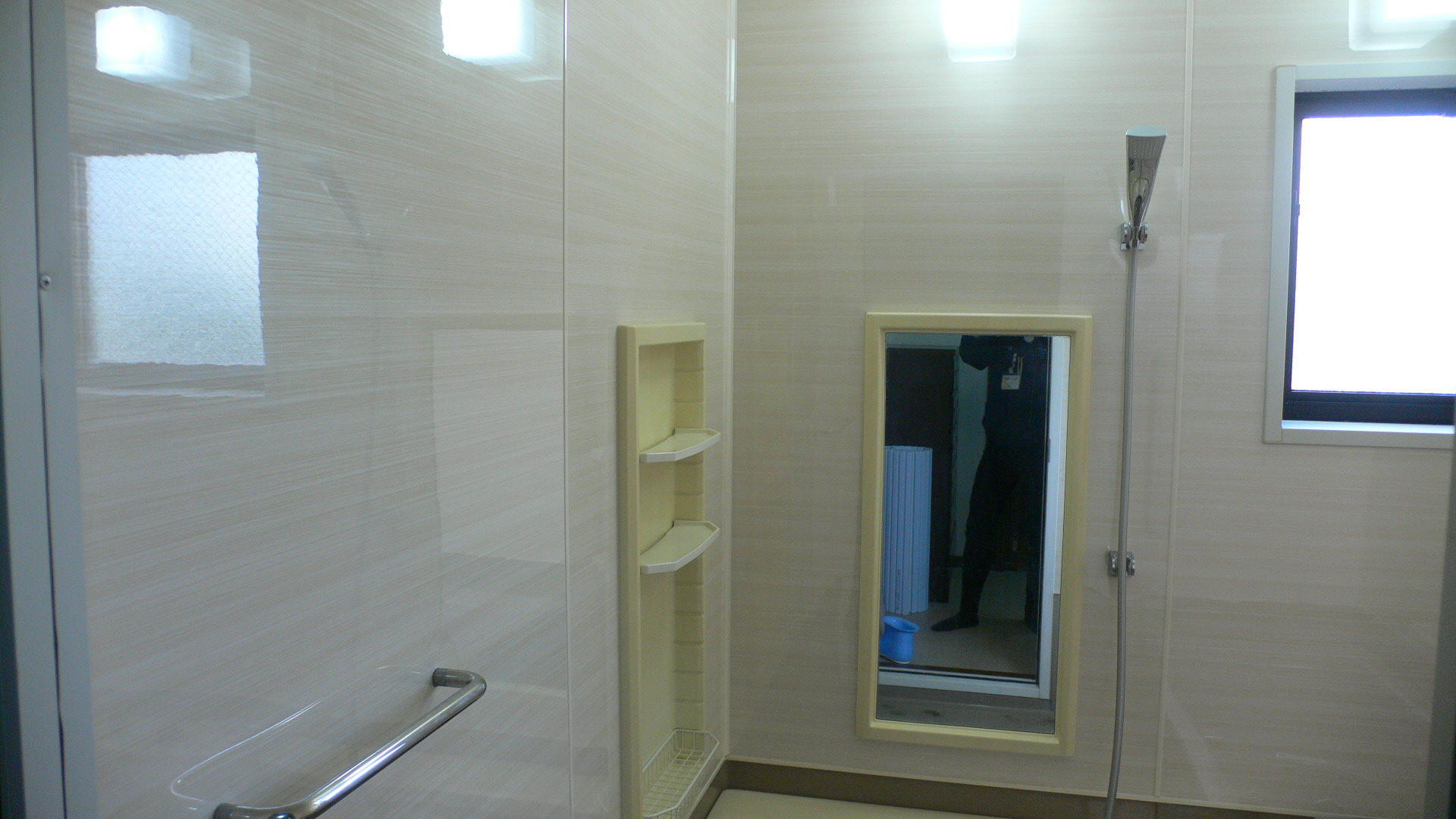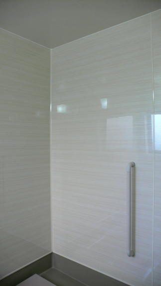 ユニットハウス内の壁面パネル交換をご希望でしたが、年数が経過していたため交換ができないと判断し、上からパネルを張る施工方法に変更いたしました。アイカのバスフィットパネルで職人さんに貼っていただきました。