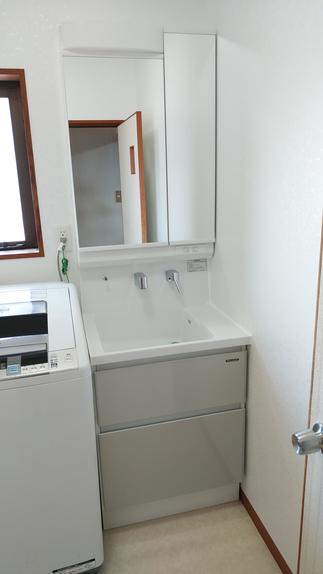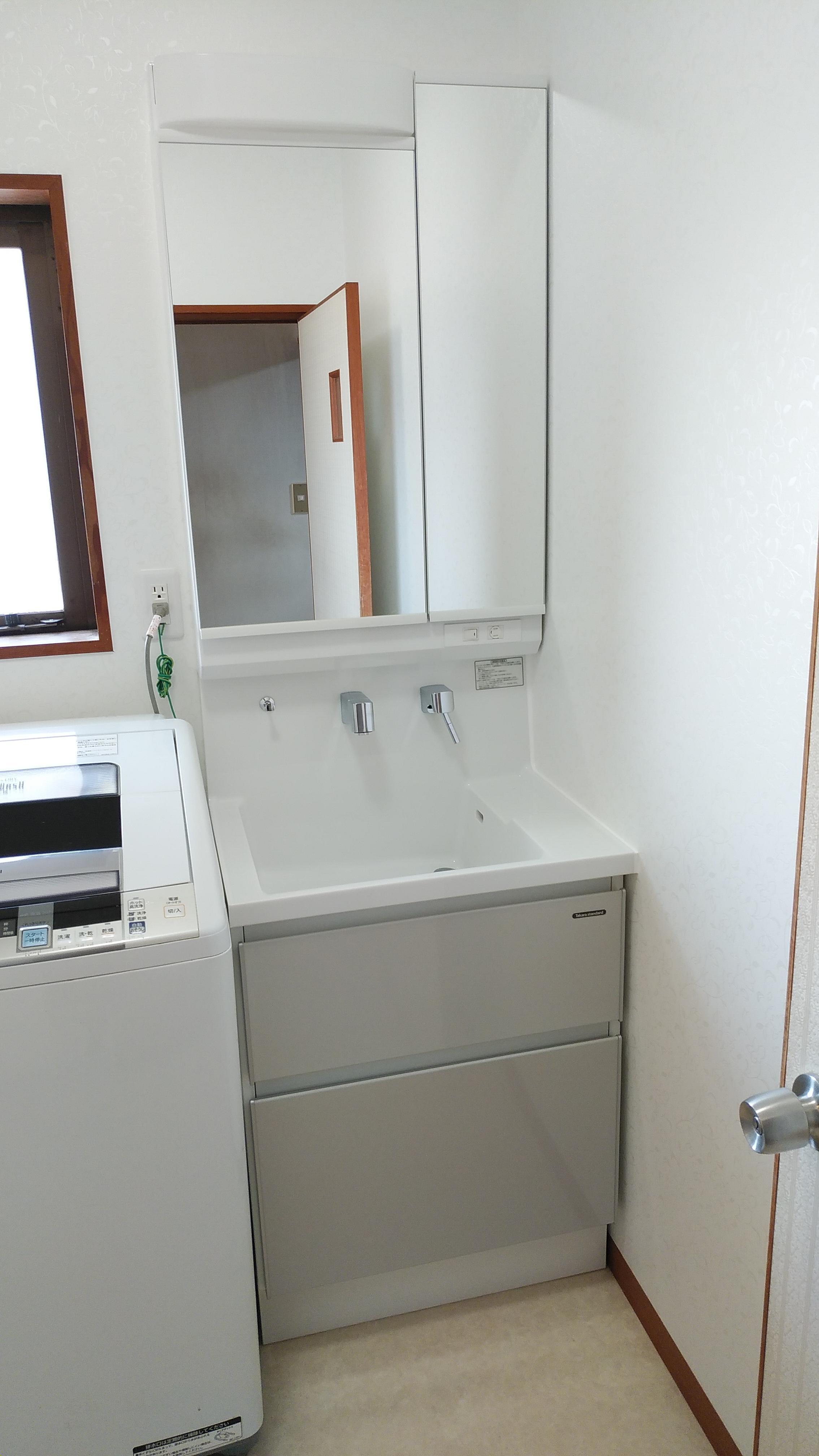 システムバスはタカラスタンダード ミーナ1216。洗面化粧台ファミーユ600。