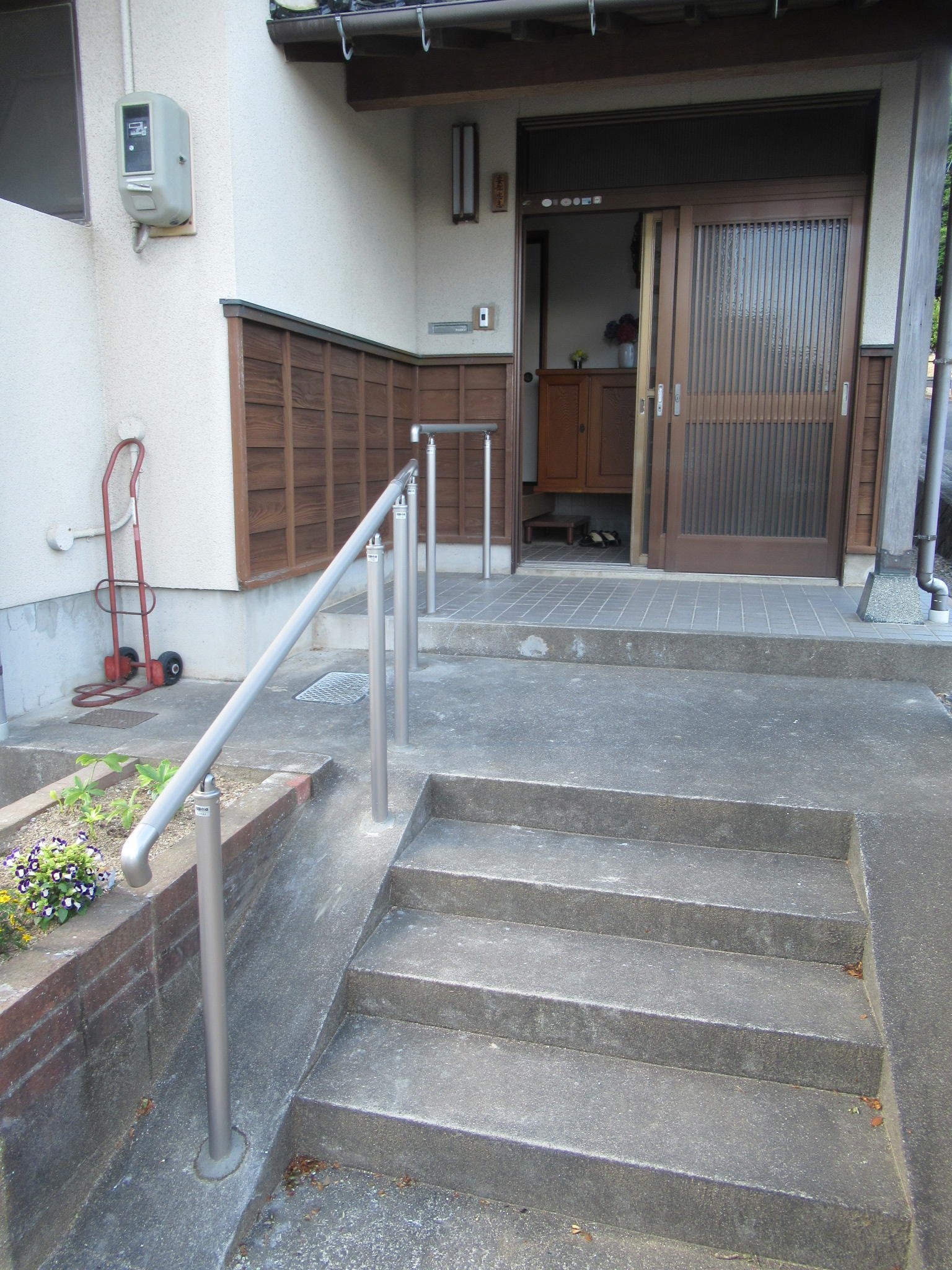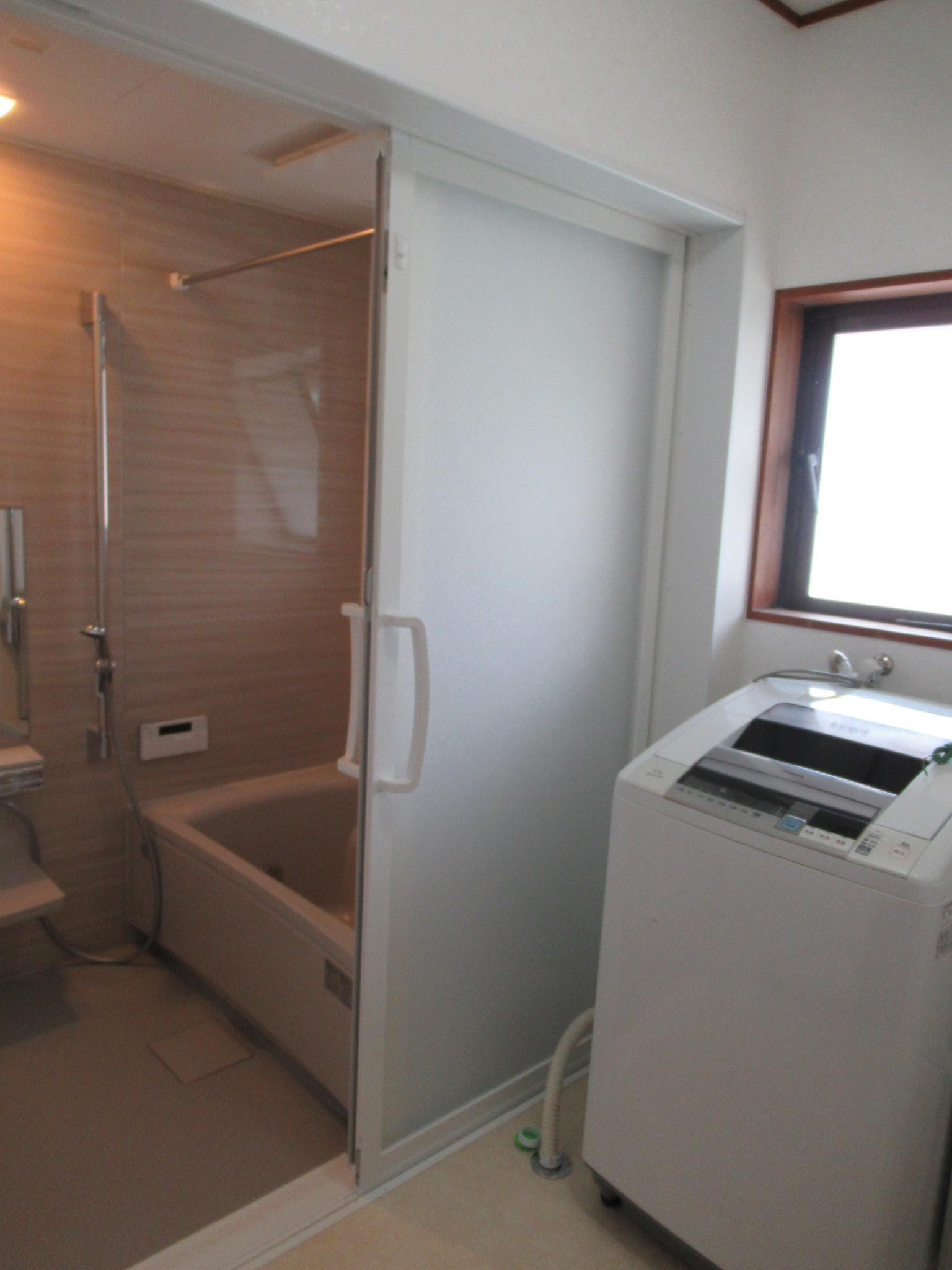 脱衣室は床、壁、天井の内装工事も含みます。また、同時に玄関前の階段が危ないので手すりも設置いたしました。