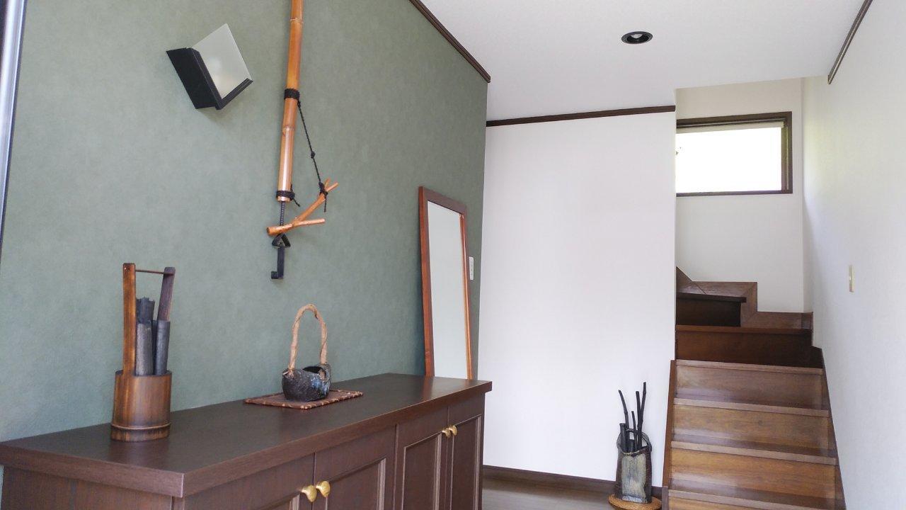 内装は玄関のみ思い切ってアクセントとして深い緑を選ばれました。かなり悩まれたみたいですが・・・完成すると和風な感じがとても気に入っておられます。小物使いも素敵です!!!