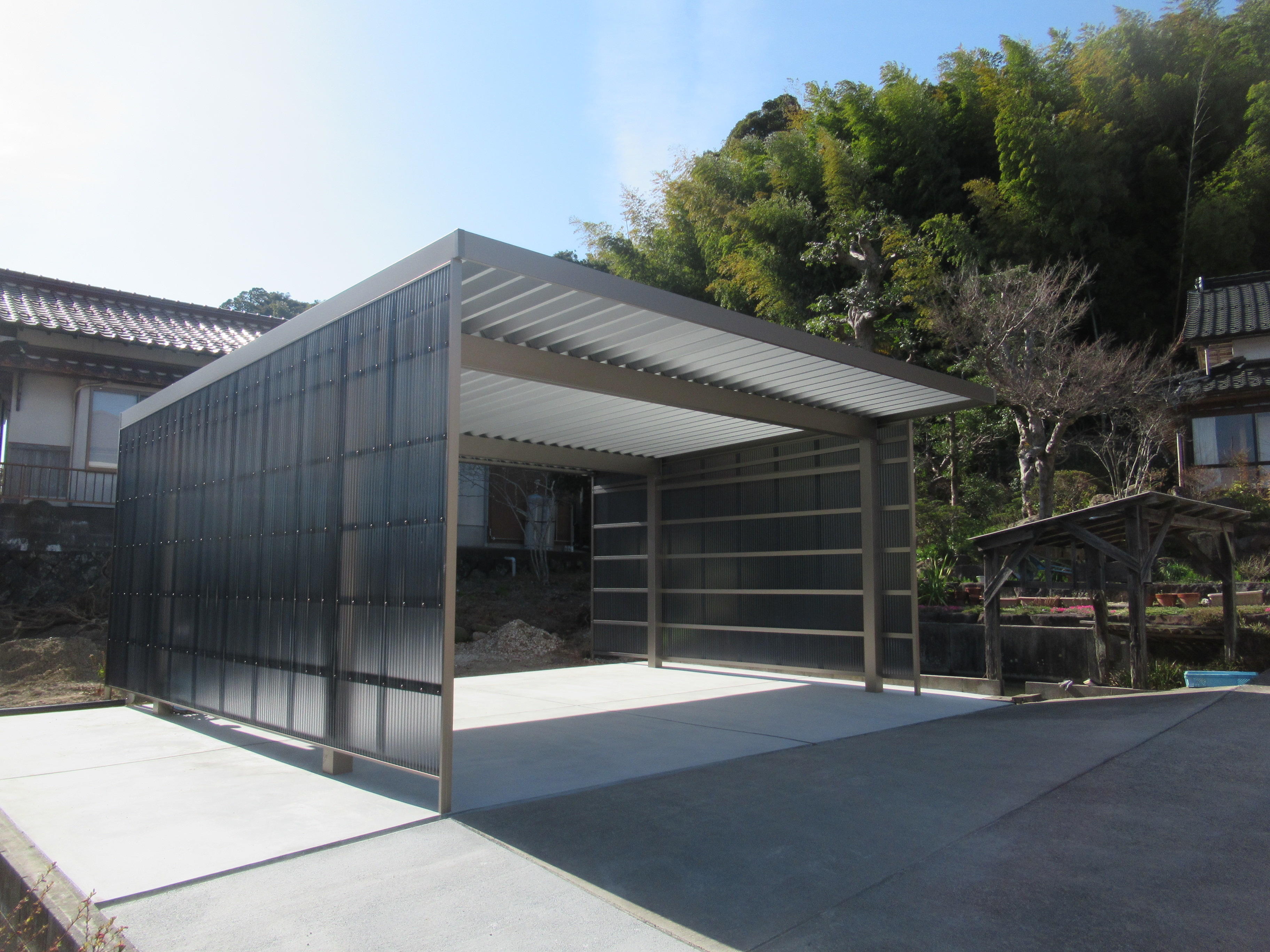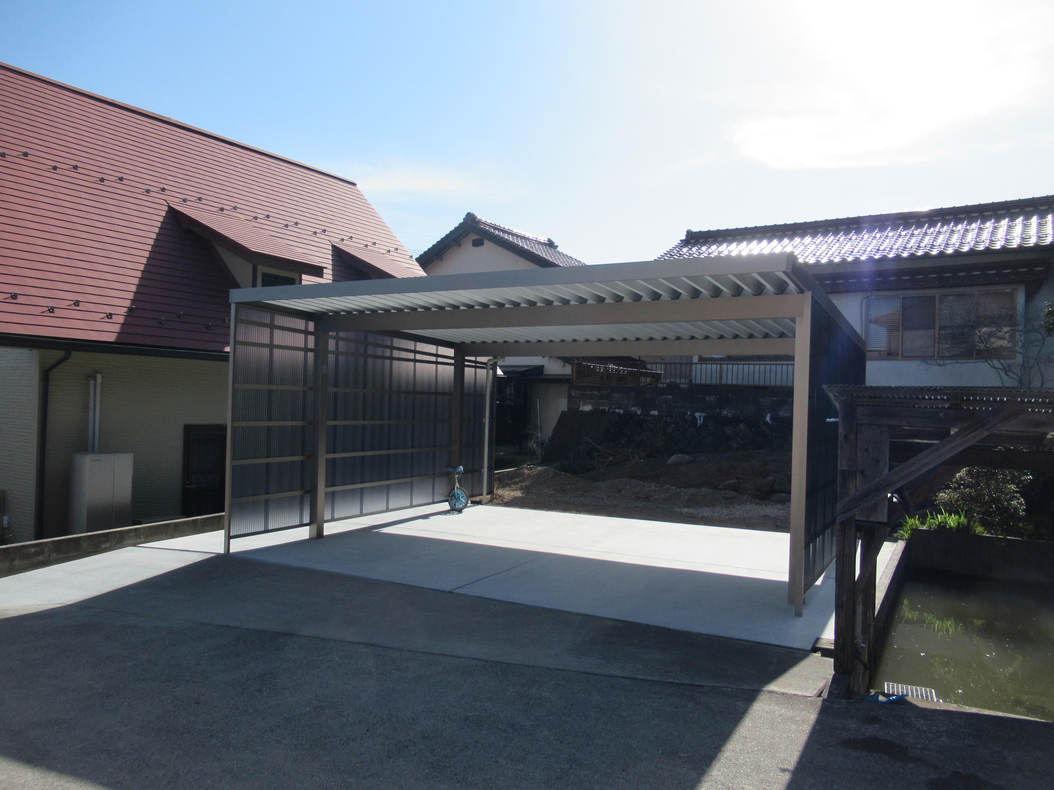 車庫をご検討の御施主様です。畑仕事用の作業場としても活用したい。また、お孫様の自転車置き場にも利用したい。そんなご希望で、2台用折版屋根カーポート積雪50㎝対応タイプをご提案。壁パネルで作業や自転車置き場としても活用できます!ロング柱で広々として空間も確保!