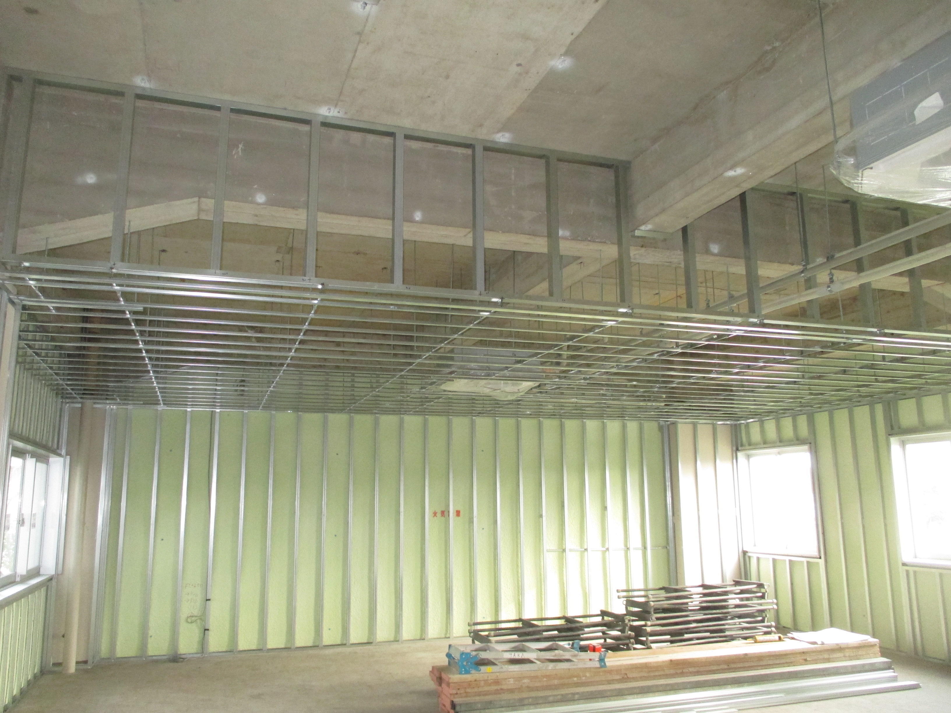 天井・壁の下地を作っています。LGS(エル・ジー・エス)という、軽量鉄骨壁下地を使っているそうです。
