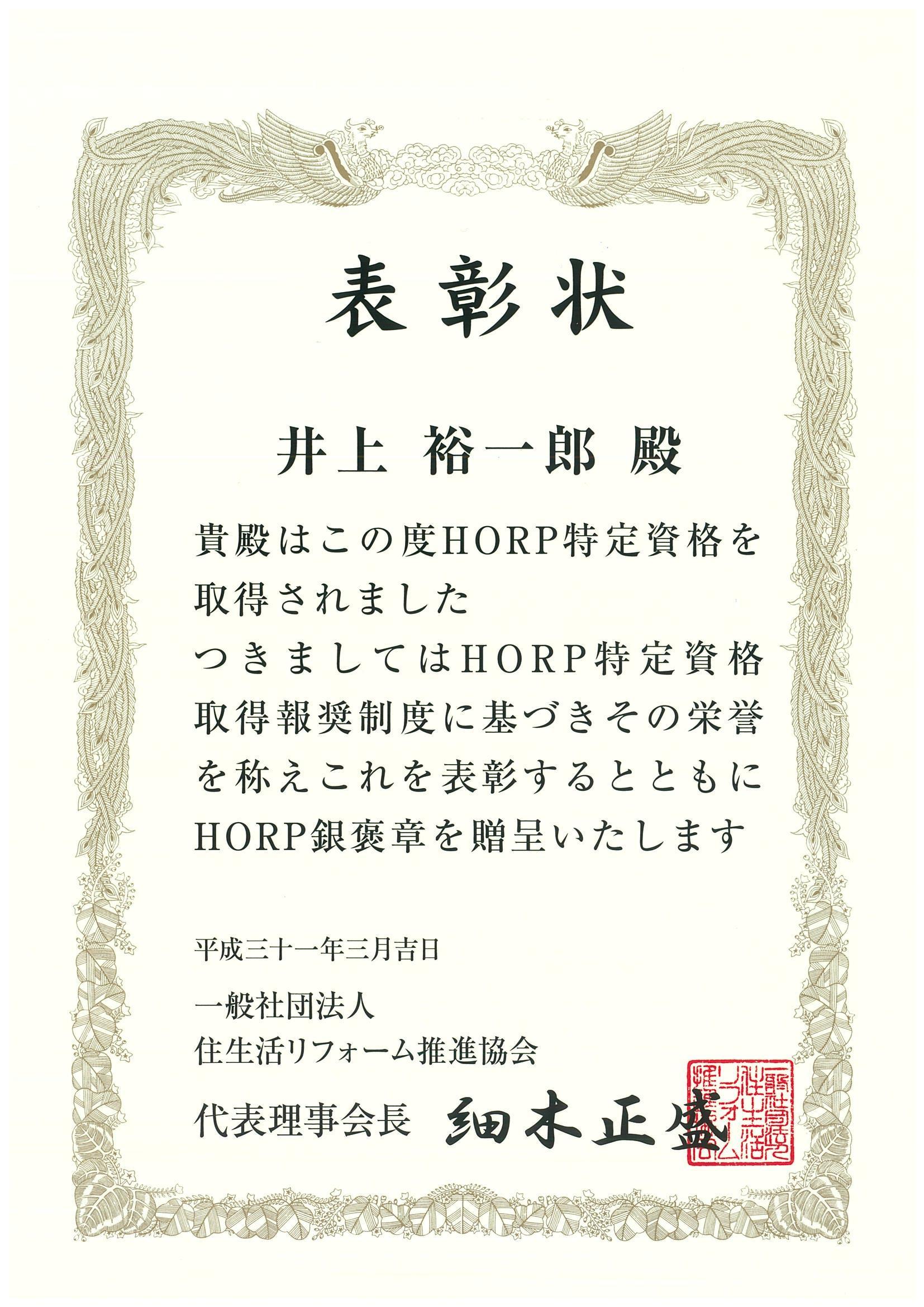 そして、今回、一般社団法人住生活リフォーム推進協会より、井上裕一郎さんの資格が