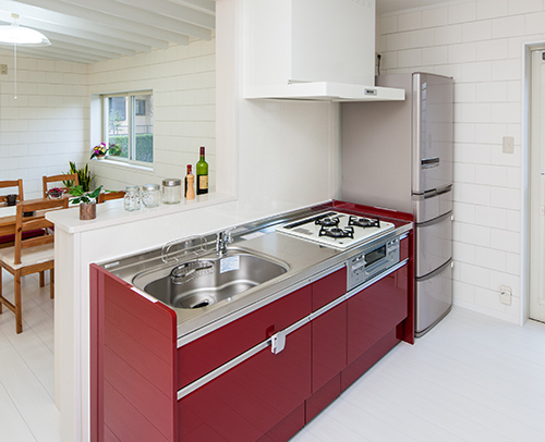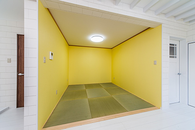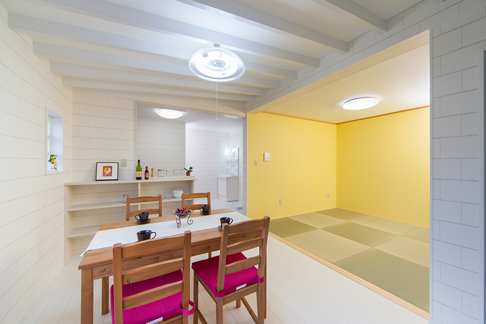 お客様のご希望をおうかがいし、全体的に白を基調とした明るいリビングダイニングに大変身。畳スペースの黄色い壁や、赤いキッチンは思い切った色使いで個性が感じられます。