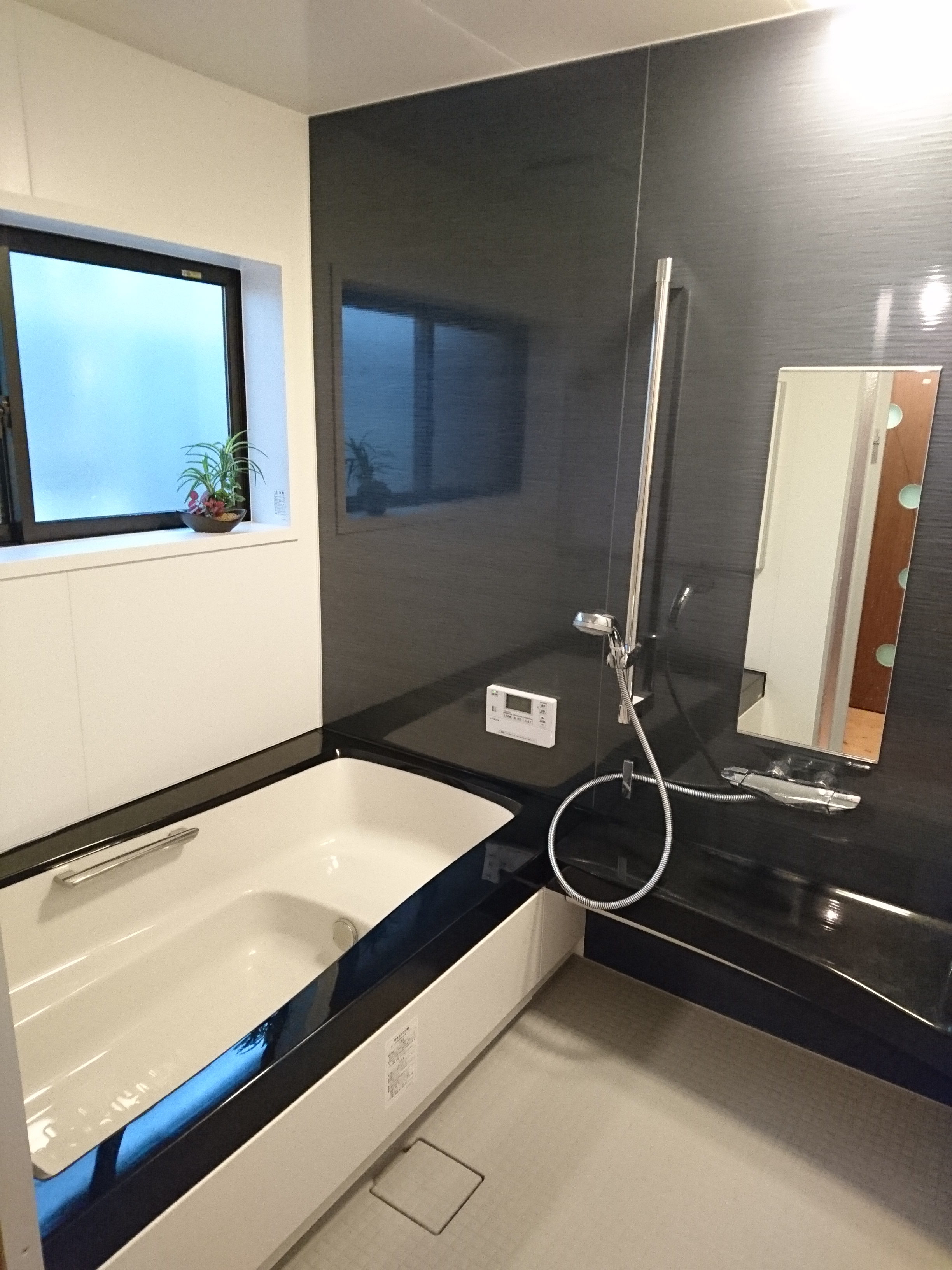お施主様こだわりの浴室。落ち着いた色合いが特徴的です。
