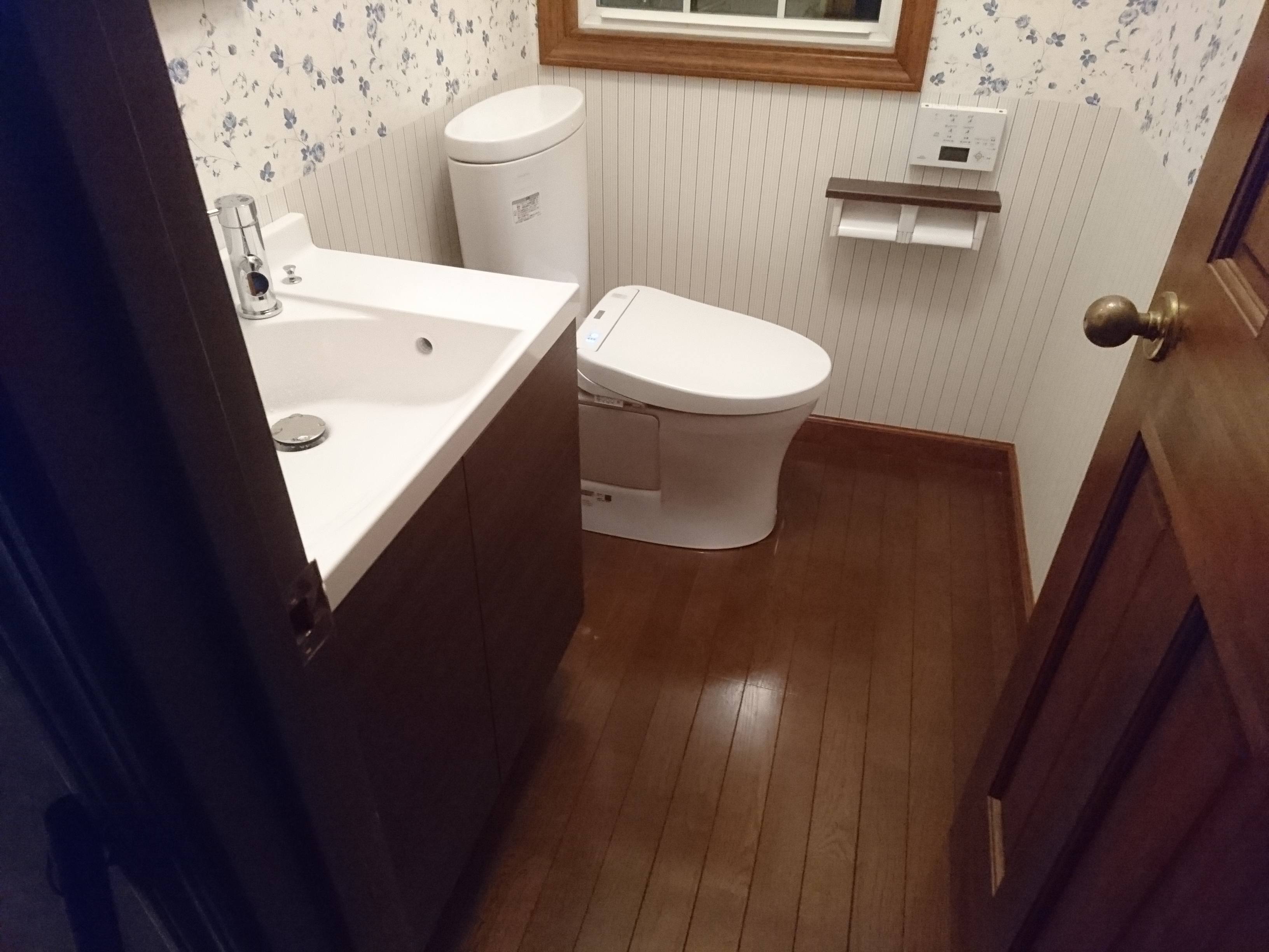 トイレにはコンパクト洗面化粧台を取り付けたので、おしゃれで使い勝手の良いトイレになりました。節水タイプのトイレは家計にも優しいのでおススメです。