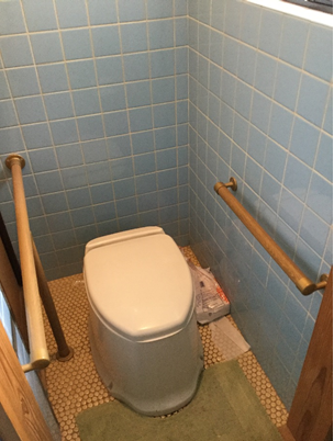トイレはサティスGを採用。壁にはアクセントになるようにエコカラットを取り付けました。タイル貼りだった壁、天井、をクロスに、床はCFシートにしました。白を基調に清潔感のある空間になりました。