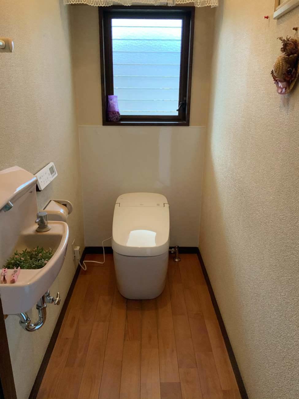 新しく設置したトイレはサティスGで、100年クリーンの新素材アクアセラミックで、水アカがこびりつかず100年新品のツルツルが続きます。電動お掃除リフトアップ機能ですき間汚れをラクラクお掃除出来ます。泡クッションで尿ハネを軽減し、床や壁からのニオイ発生も防いでくれます。パワーストリーム洗浄機能によって少ない水量で、しっかりと洗い流してくれます。お手入れ簡単でお財布にも優しい万能トイレです!