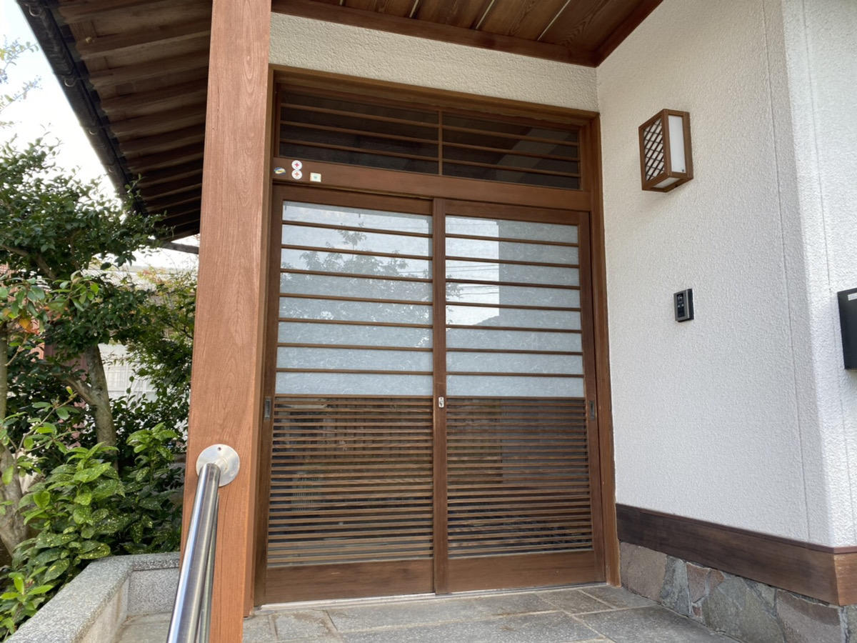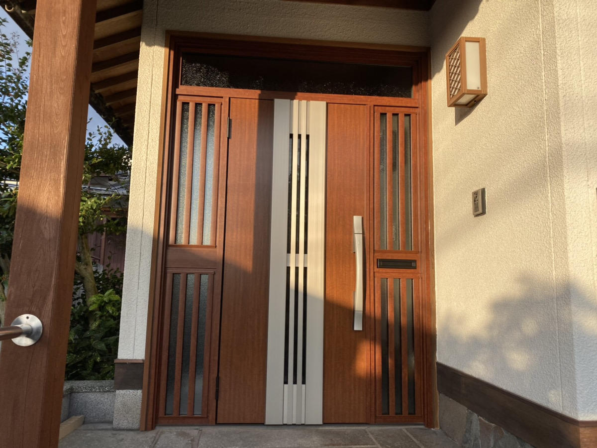 木製の引違いの玄関でした。台風の時等、強い風が吹くと、風を受けてたわんでしまいます。 色合いもよく、堂々とした玄関になりました。そして便利なポスト付き!