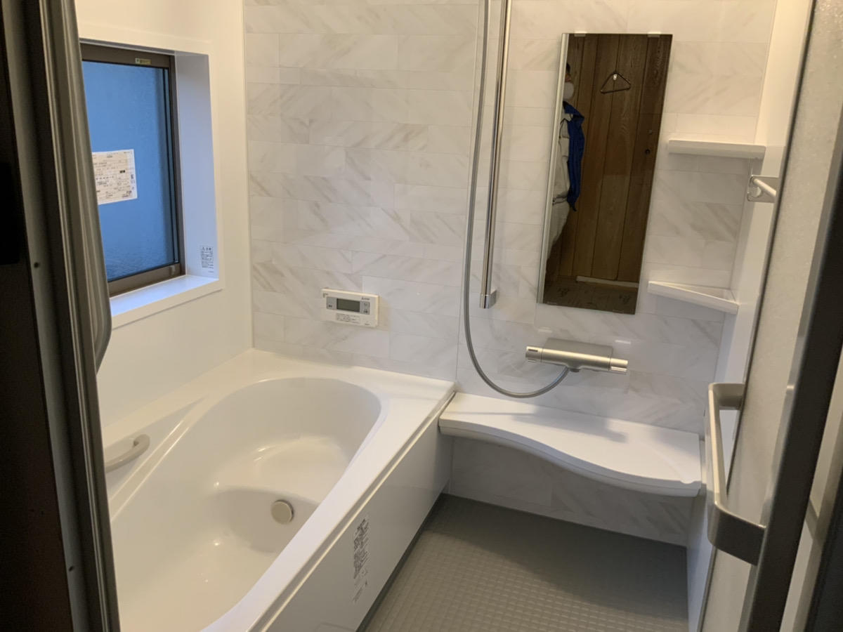 全面タイルの浴槽でした。オートタイプの給湯器でお風呂が自動で溜まるようになり、見た目もスッキリ!