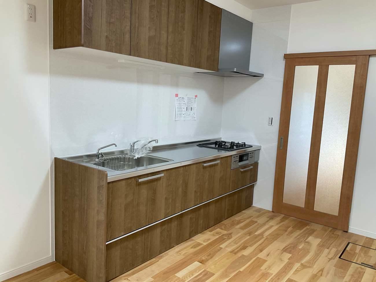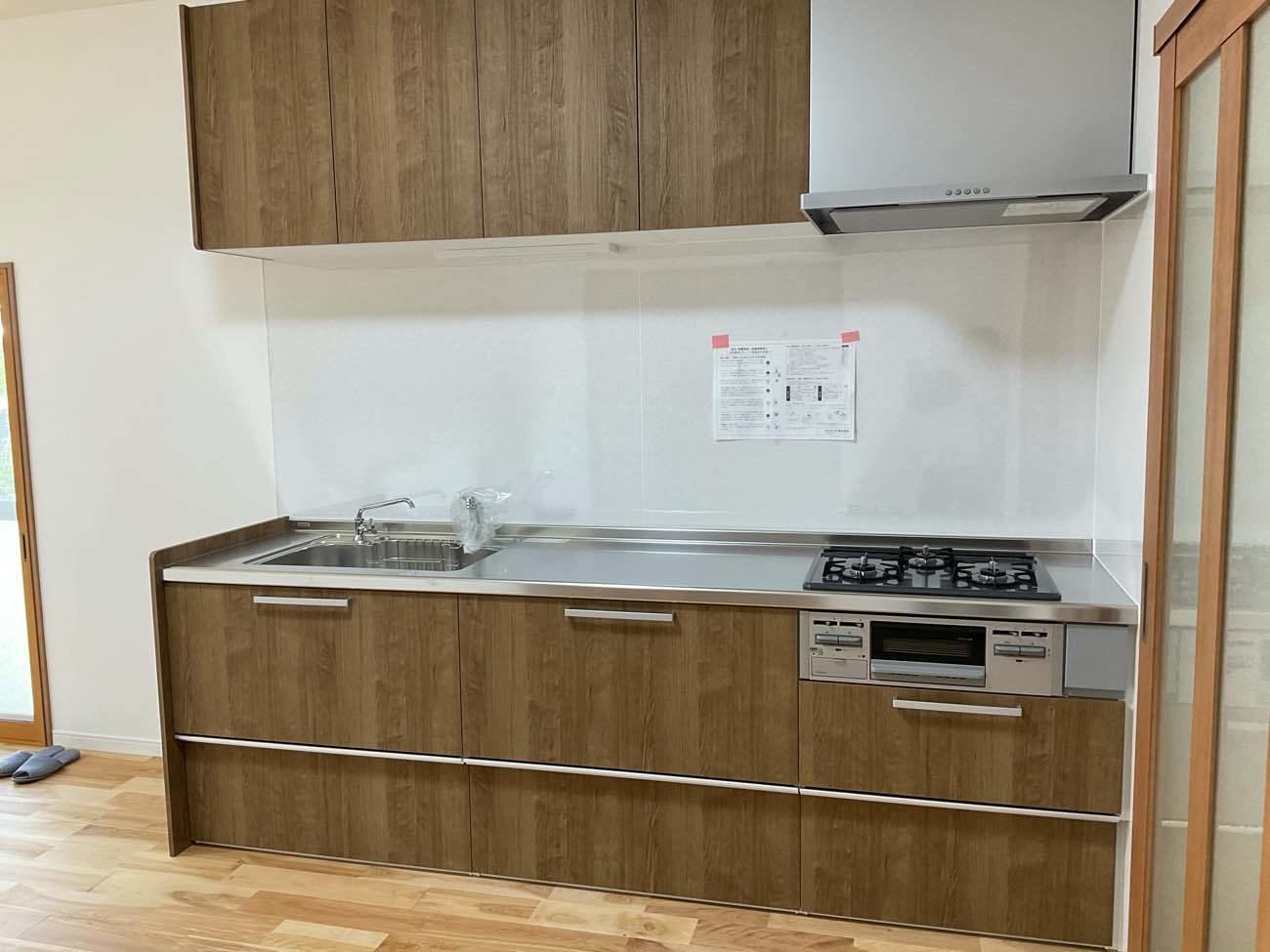 落ち着きのある茶色のキッチンです。壁付けで、上にも収納を取り付けています。