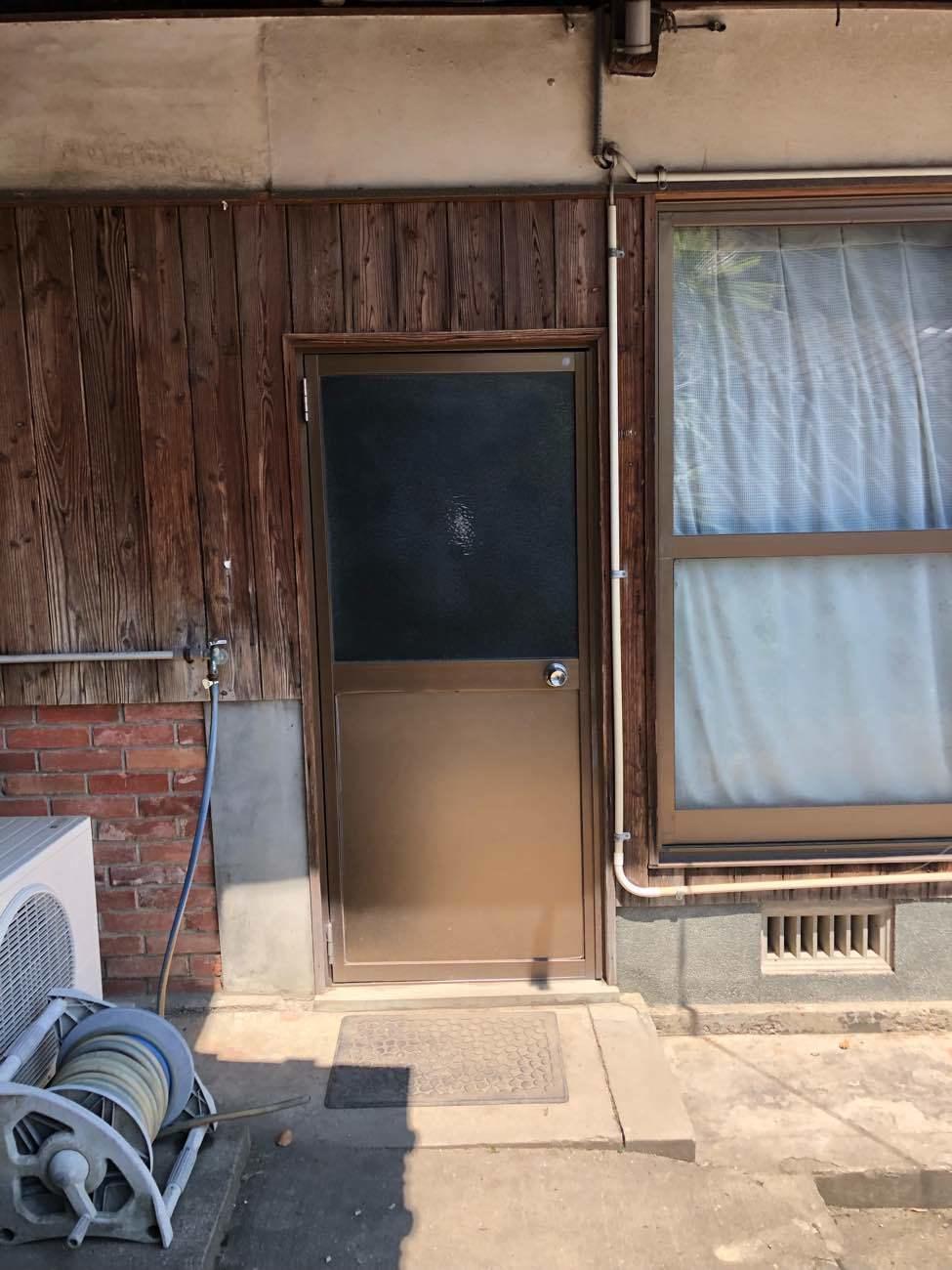 元々の勝手口ドアは、外部トイレのドアとして再利用しました。 ペアガラスにして、勝手口付近の寒さを軽減できます。