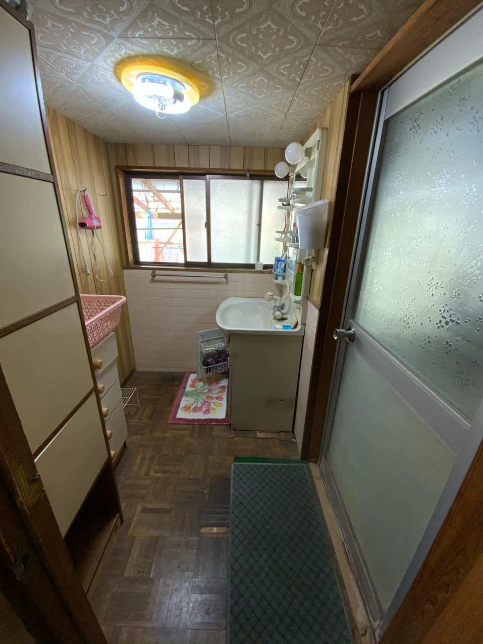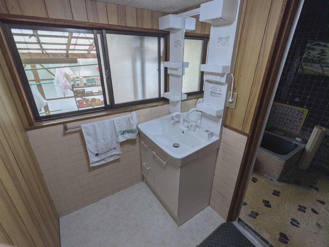 水漏れをおこし床がぶわぶわしてしまっていました。放置すると腐っていってしまいます。 床はクッションフロアに張替、洗面台を取替ました。エコハンドルがついており、よく使う正面のハンドル位置で「水」を出す省エネ設計です! お湯を無意識に使うことがないため、無駄な給湯エネルギーを使いません。