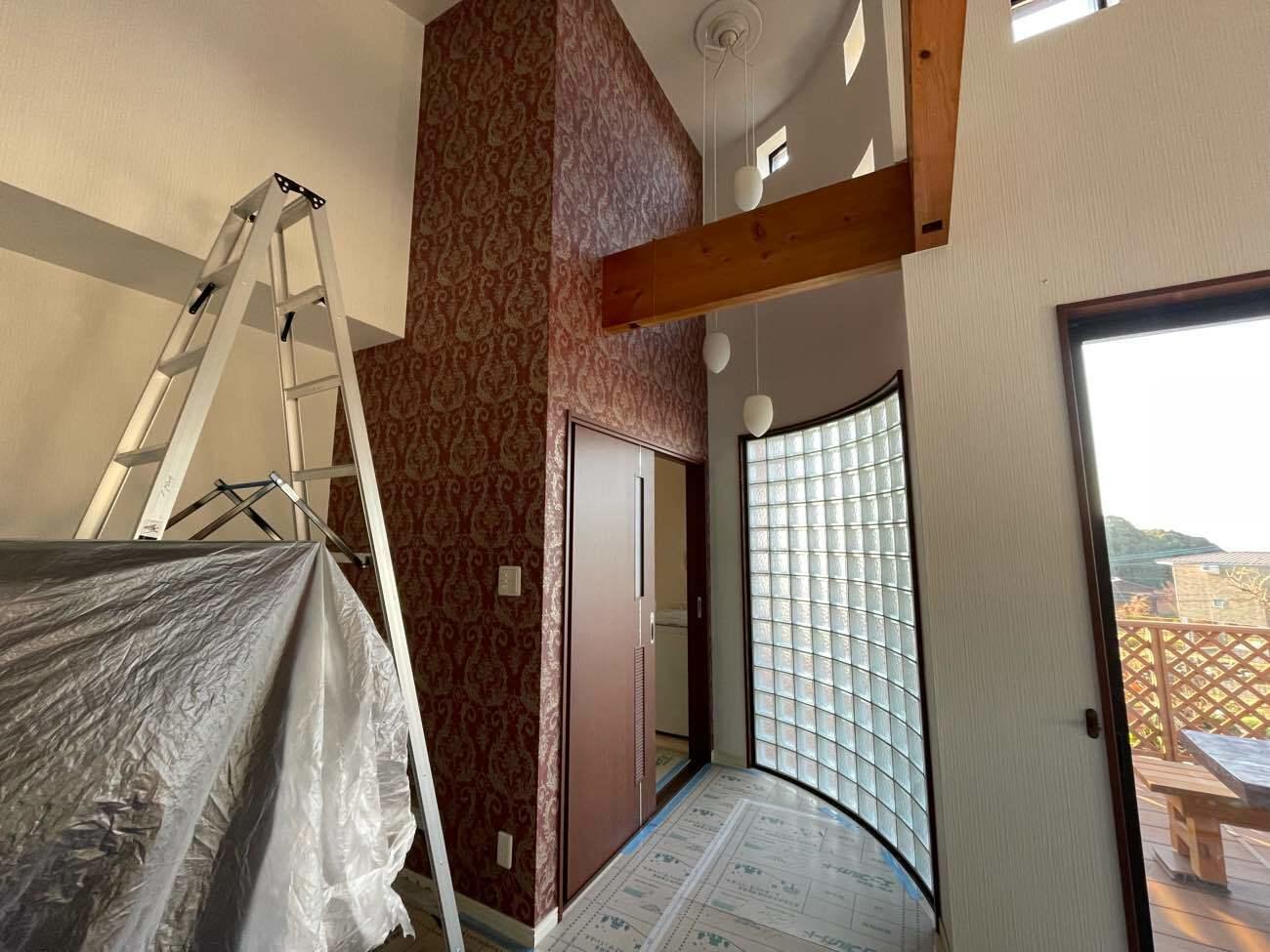 左奥のアクセントクロス部分をガラッと色を変えて模様替え