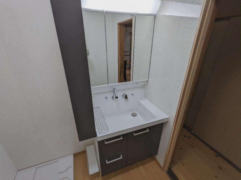 洗面台の取り替えとともに、クロスや床も貼替ました。 三面鏡の扉を開けるとすべて収納になっていて収納力抜群です。