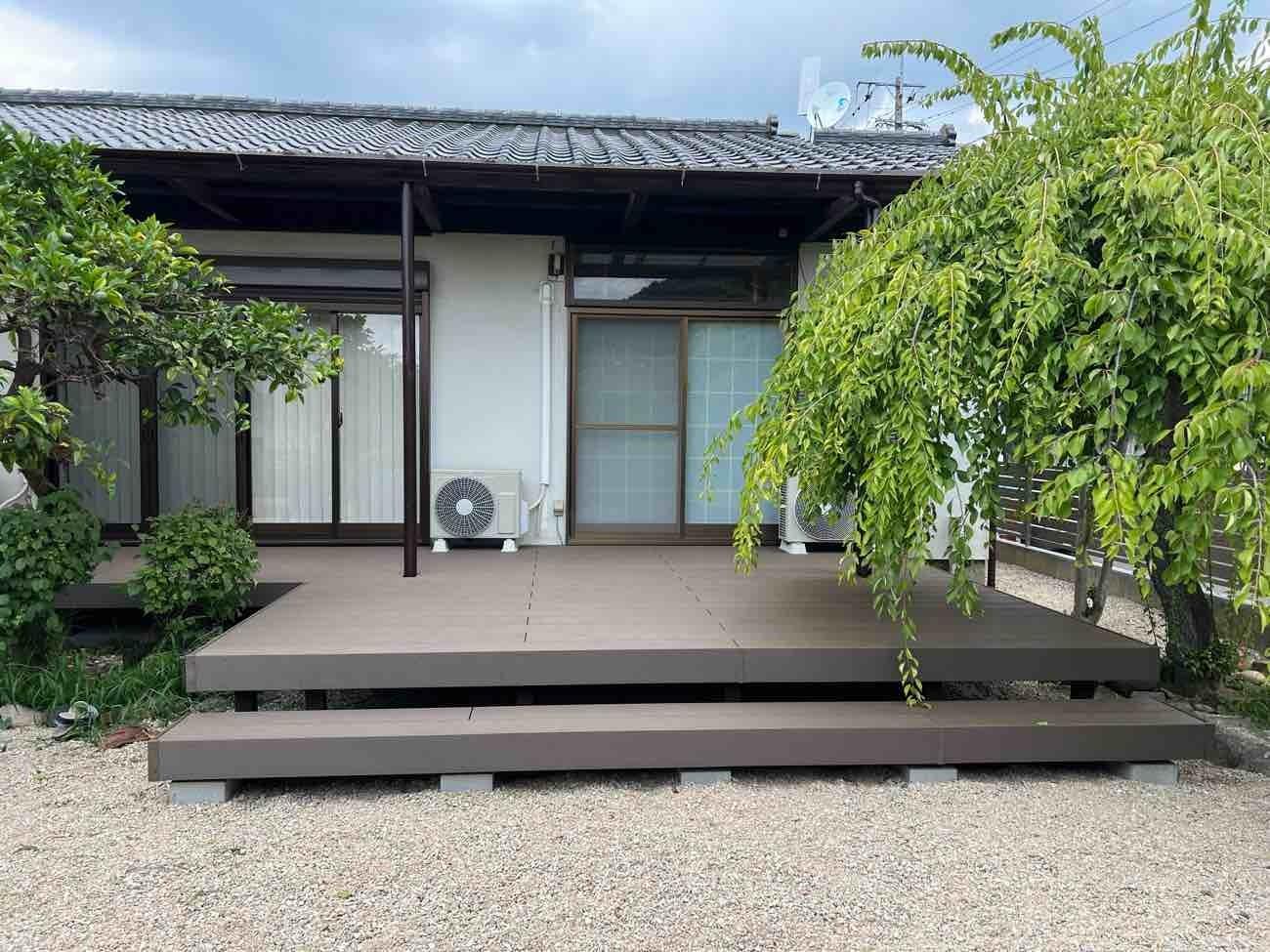 家に合うカラーリングでかっこいいですね。施工したウッドデッキは、LIXILの樹ら楽ステージです。 「樹ら楽ステージ」は、太陽光線を反射し、昇温抑制効果のある特殊タイプの顔料を採用。夏季でも表面温度の極端な上昇を抑えます。 お庭に合わせて色々な形状に対応可能です!