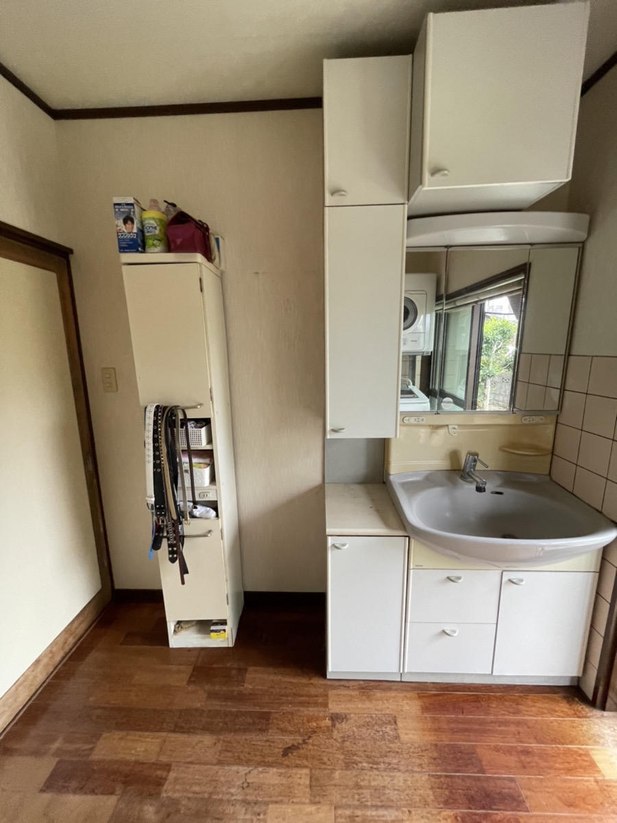 リクシルのL.C.は水栓が上からついていて、水栓まわりに水がたまることもなく、よごれにくいため、掃除が楽です。 I様も水栓が気に入られたようでした! 既存の洗面化粧台を取り外した際に、背面のクロスの色がまわりとあっていなかったり、施工跡が見えるようになってしまったりすると、クロスの貼り換えもしていた方がいいこともございます。