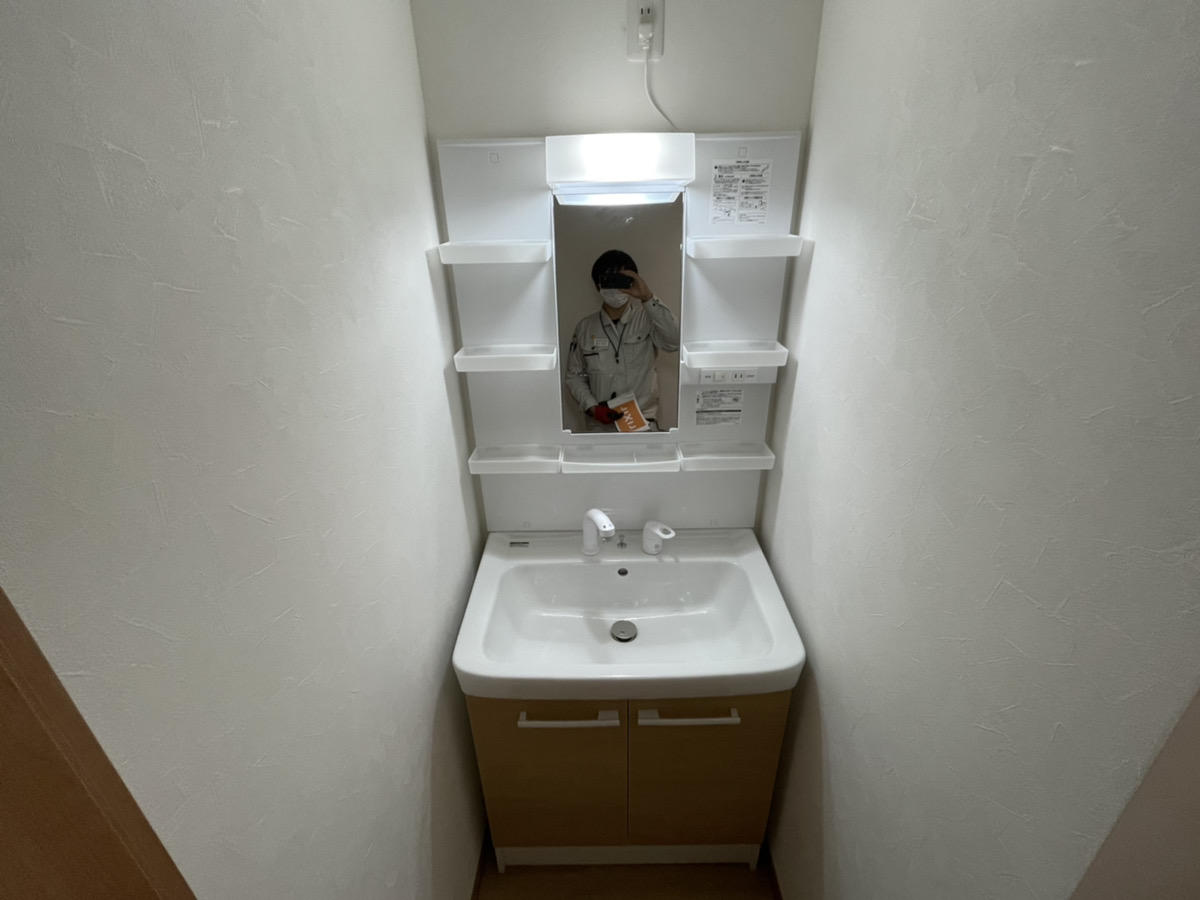 今回取り付けたオフトは、水洗の根本に約5℃傾斜がついており、水滴が残りにくいようになっています。オフト以外のリクシルの洗面台では、壁に水栓が付いているものや上部についているものがあり、掃除のしやすさ等おすすめポイントありますので、古賀組SRで実際に見てぜひ比較していただきたいです。