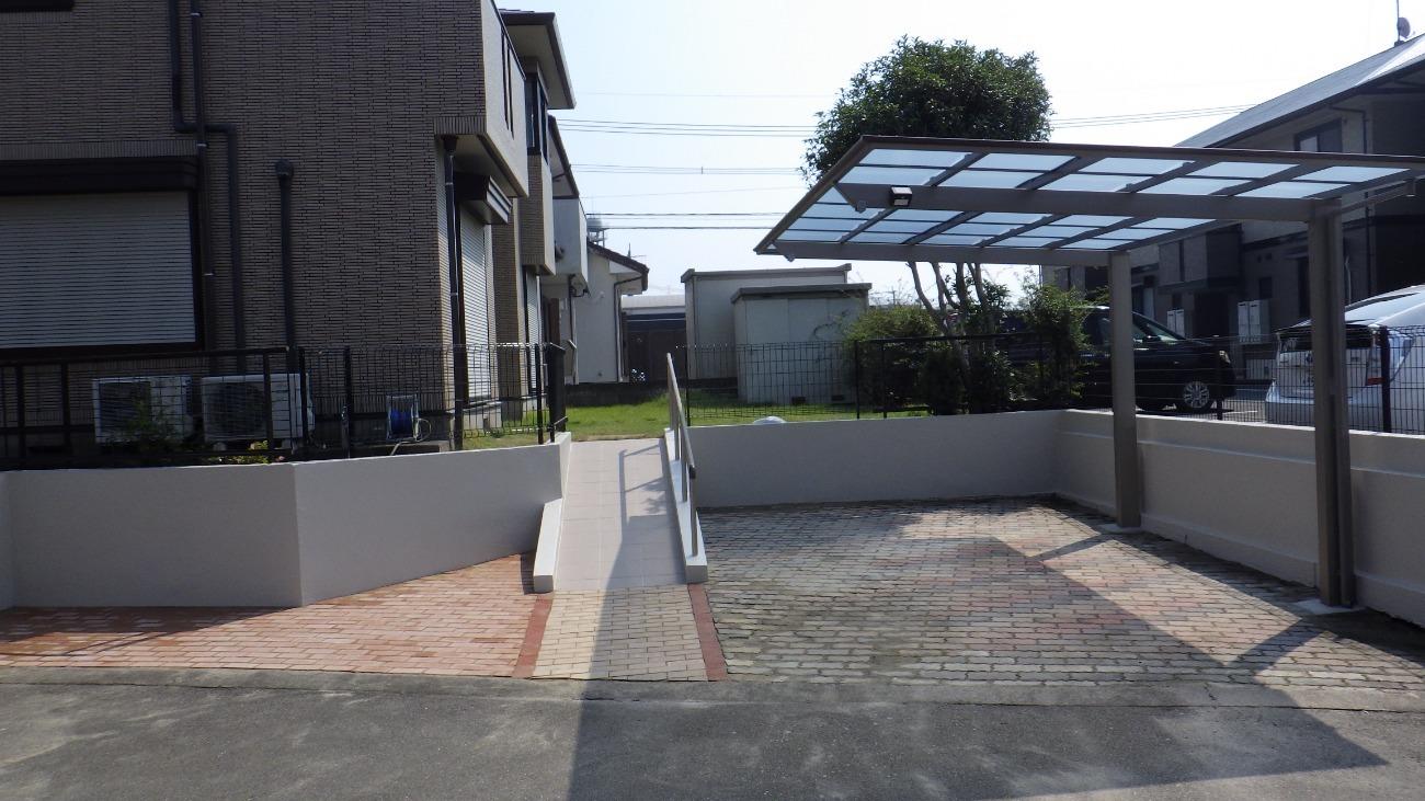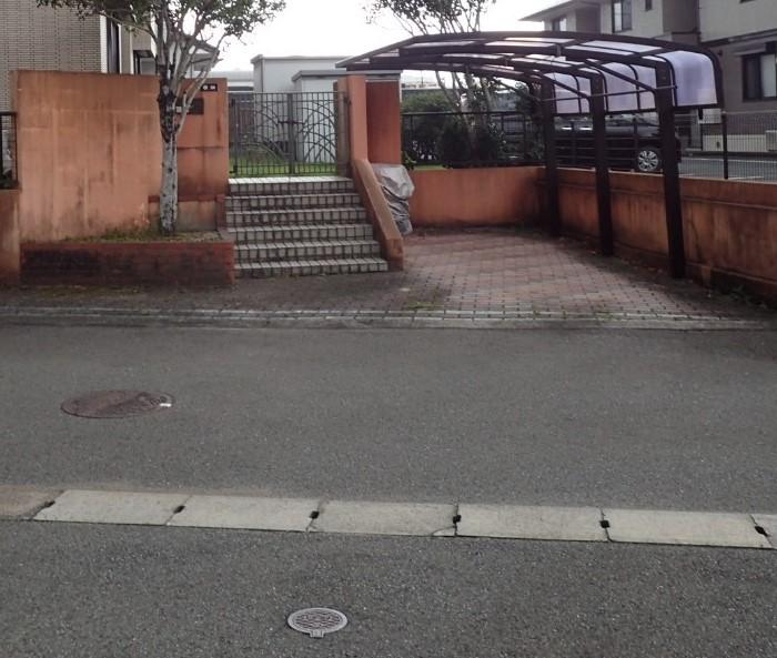 「玄関のカーポートのパネルが、アプローチのレイアウトが悪く、風が吹き上げて飛びそう、アプローチのレイアウトを変えた見積もりが欲しい、イメージプラン(パース)も出してほしい」とご依頼をいただきました。 カーポートはLIXILのカーポート フーゴFを取り付けました。 フラットスタイルなカーポートですが、耐風圧強度「42m/秒相当で、台風時にも安心です。