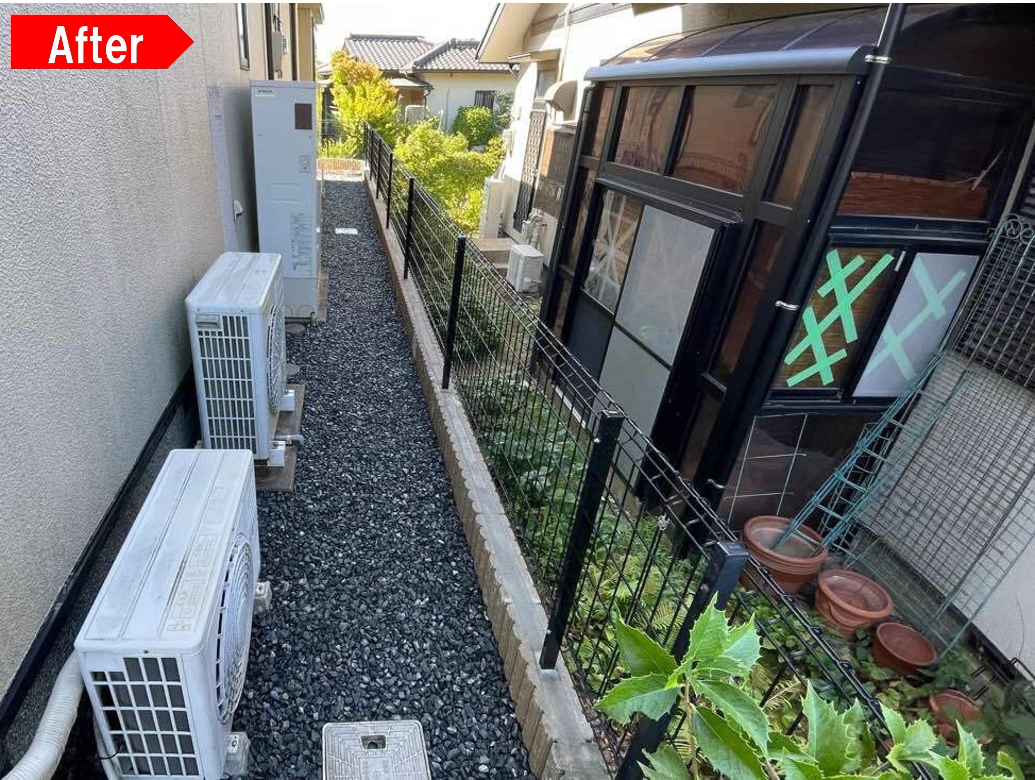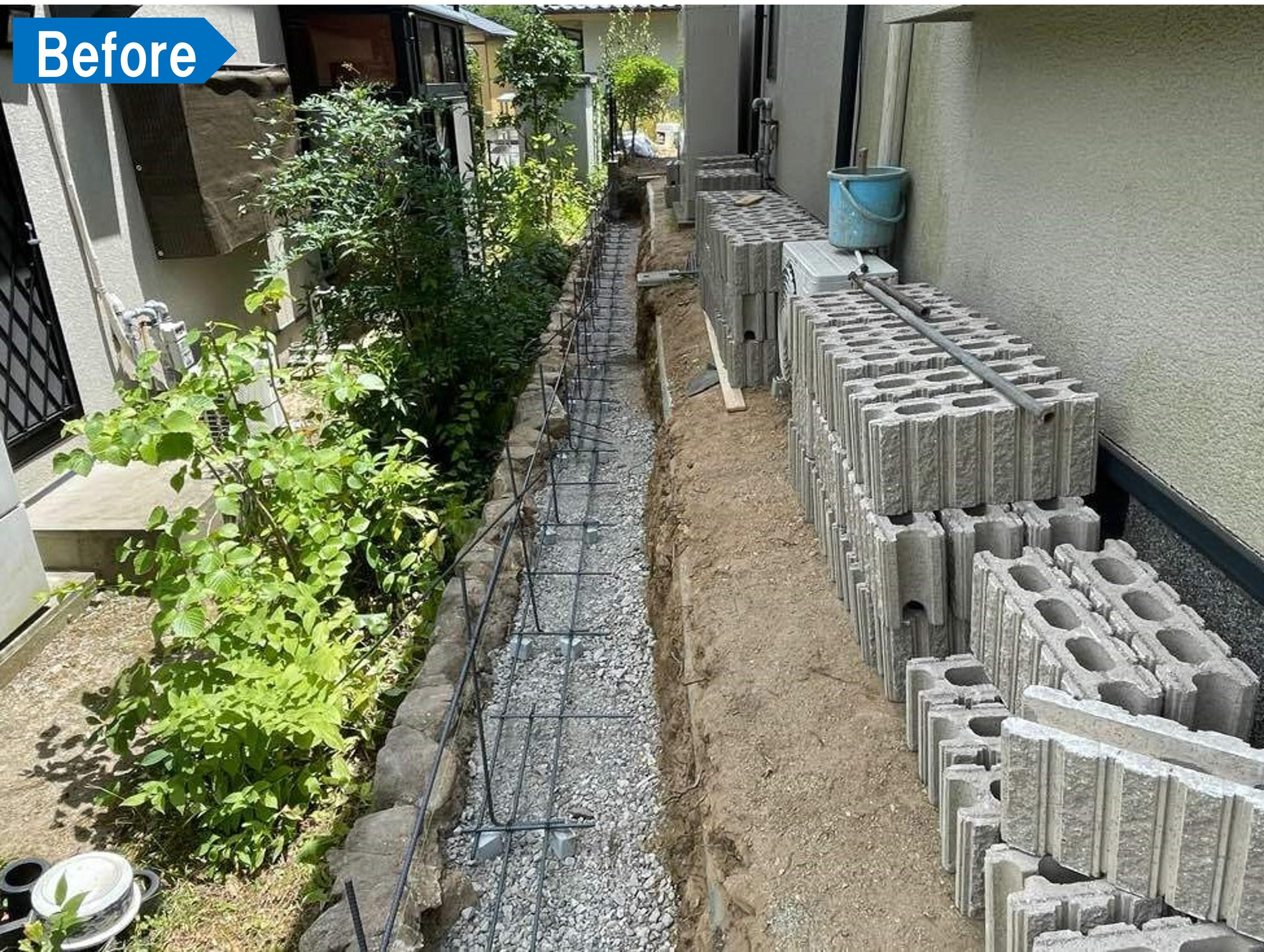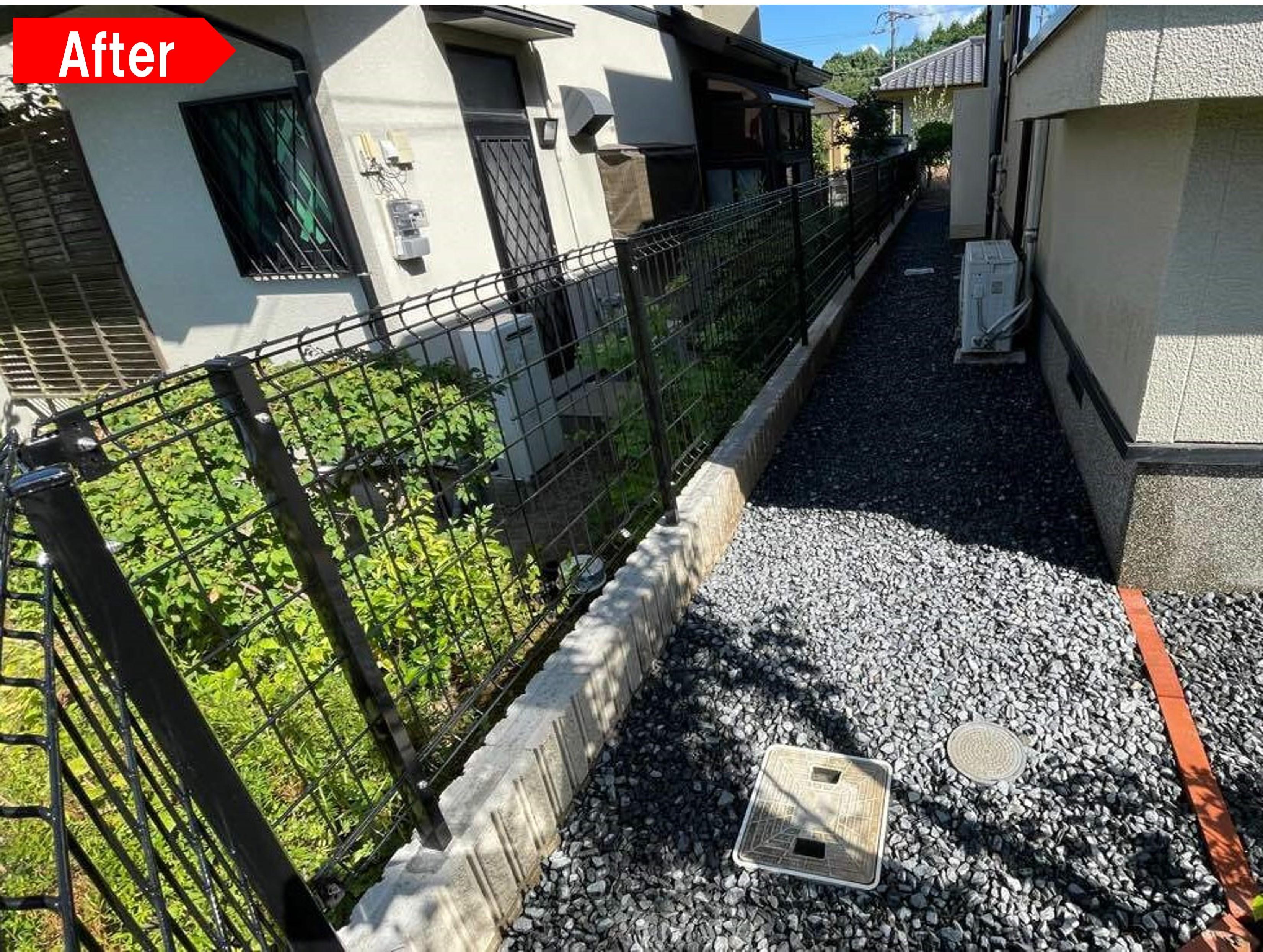 「隣家との境界の石垣から土が流れだしていて、トラブルになる前に何とかしたい」というお悩みでご相談頂きました。 ブロックを積み、フェンスを設置することで対応しました。 設置の目的やお好みに応じて複数の種類から選択可能!! お気軽にご相談ください。