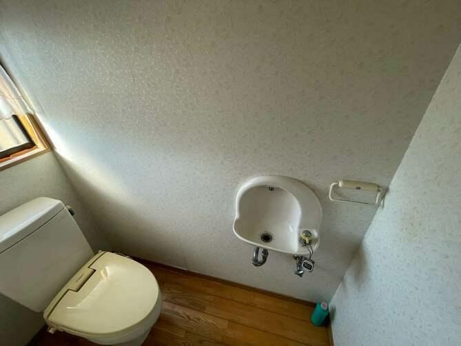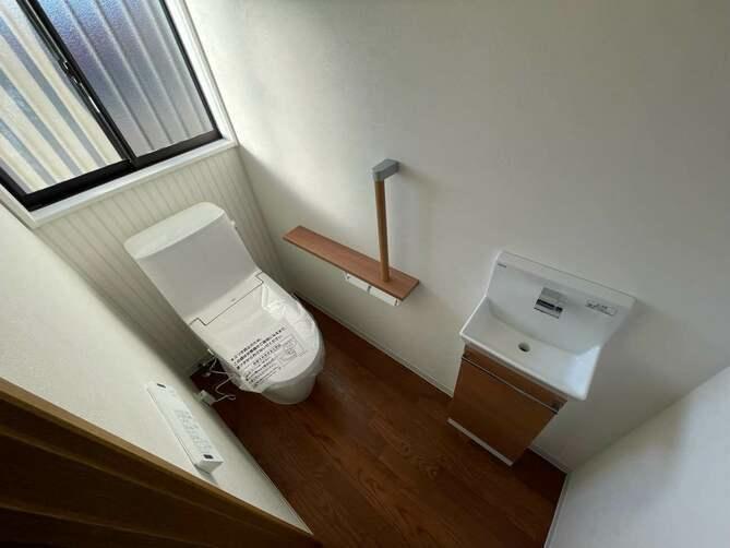 紙巻き器と手摺が一体型になっているものと、LIXIL「コフレルスリム」という手洗い器を設置しました。
