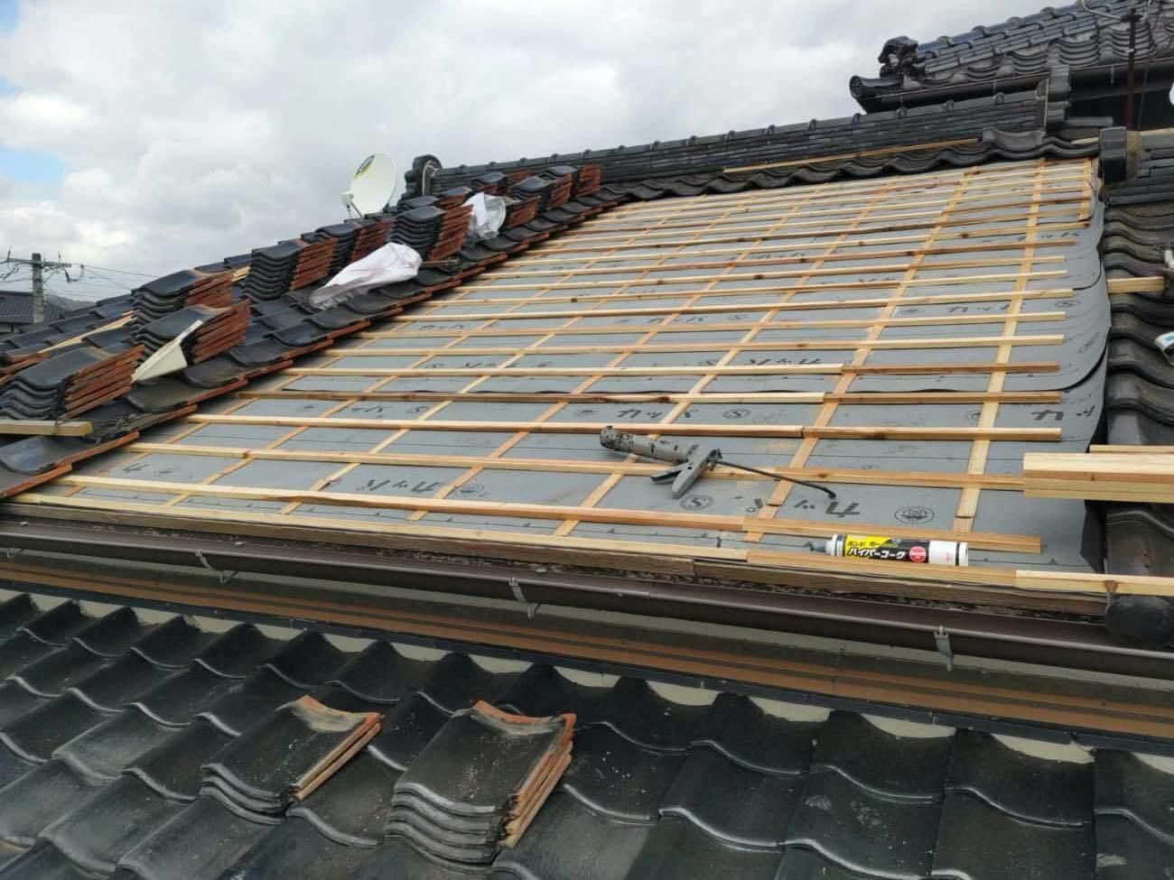 雨漏りしたところを中心に約120㎡ルーフィングの張り替えを行いました。ルーフィングとは、屋根の下に敷いている防水シートのことです。瓦などの屋根材の隙間などから入ってくる雨水が、建物にまで入ってきてしまうことを防ぎます。これが劣化してしまうと、本来の性能が発揮できず雨漏りの原因となります。今回はこれを張り替えることで雨漏りを直すことが出来ました。瓦は再度利用しています。雨漏りにお困りの方は、ぜひご相談ください。