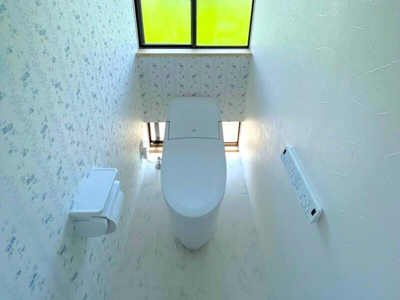 下水道の共用開始を機に、トイレ取替及び内装のご依頼をいただきました。今回ご採用いただいたLIXILの「プレアスLS」は、タンク付きのトイレでありながらタンクレストイレのようなすっきりした外観を実現しました。コンパクトなデザインでトイレ空間にゆとりが生まれます。