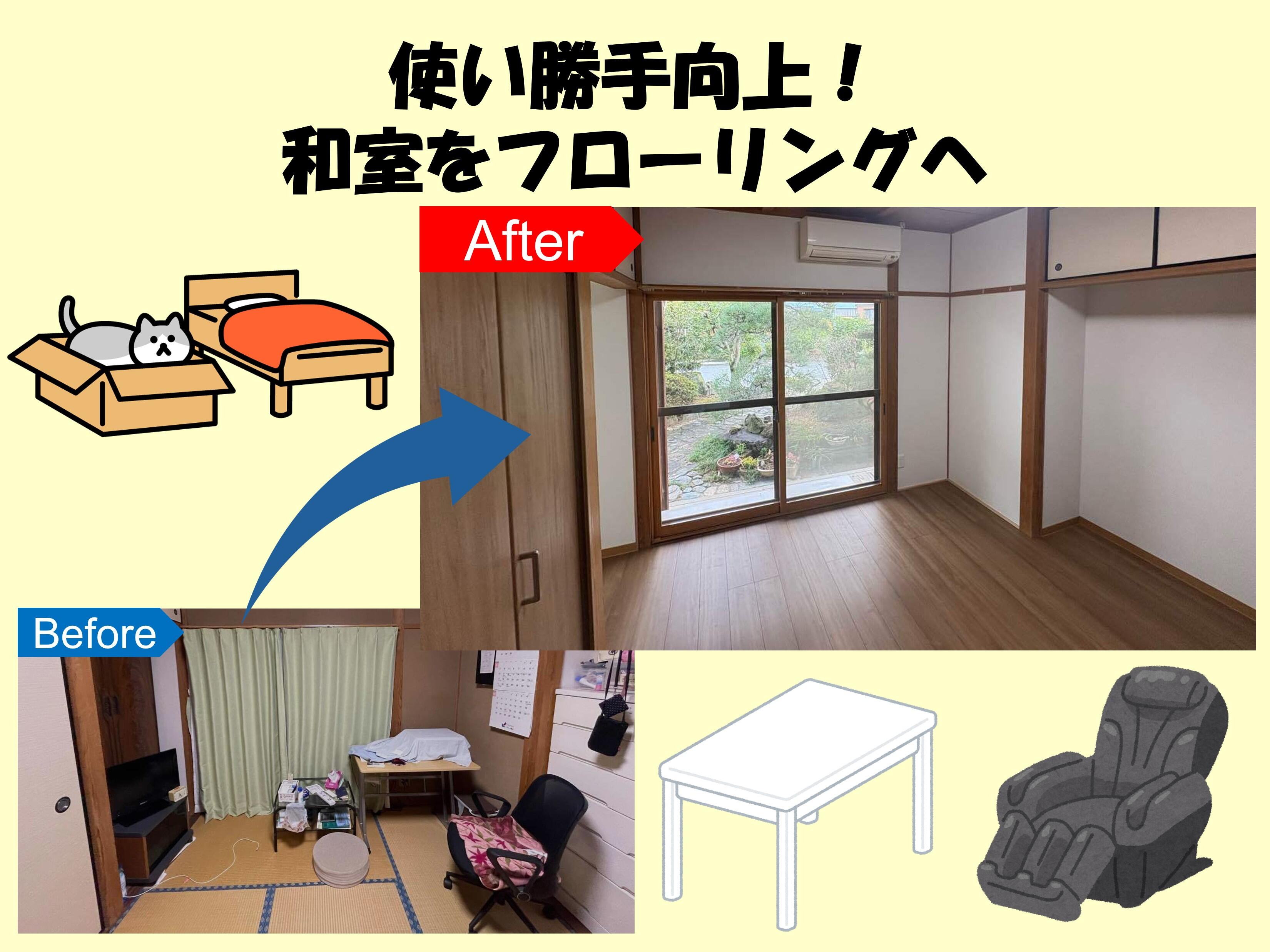 和室から洋室への改修のご相談をいただきました。洋室に改修するメリットは「家具によって床が傷みにくい」「畳の張り替えの必要がない」「掃除がしやすい」などが挙げられます。小さなお子様やペットがいらっしゃるご家庭は、「ささくれによるトラブル」も防ぐことができます。ご自身の生活スタイルに合わせて、ぜひ和室の洋室化を検討してみてください!
