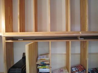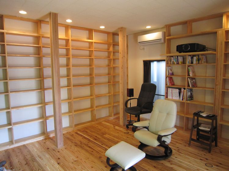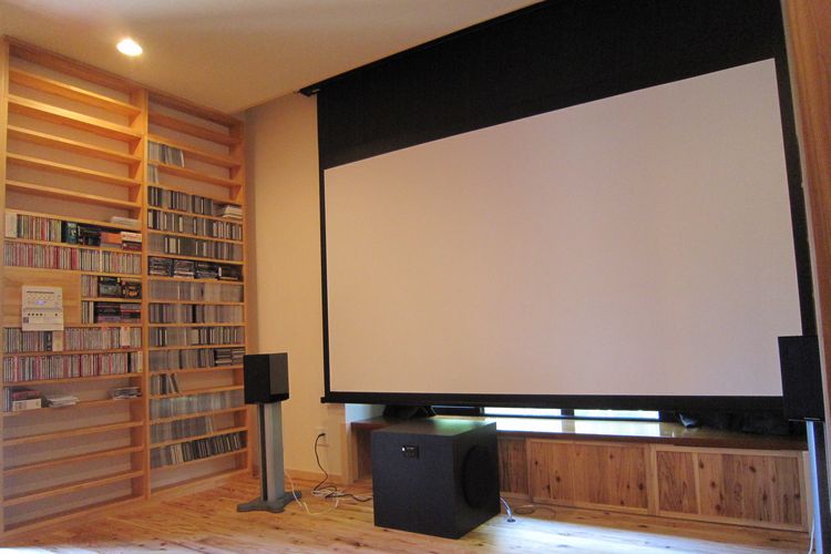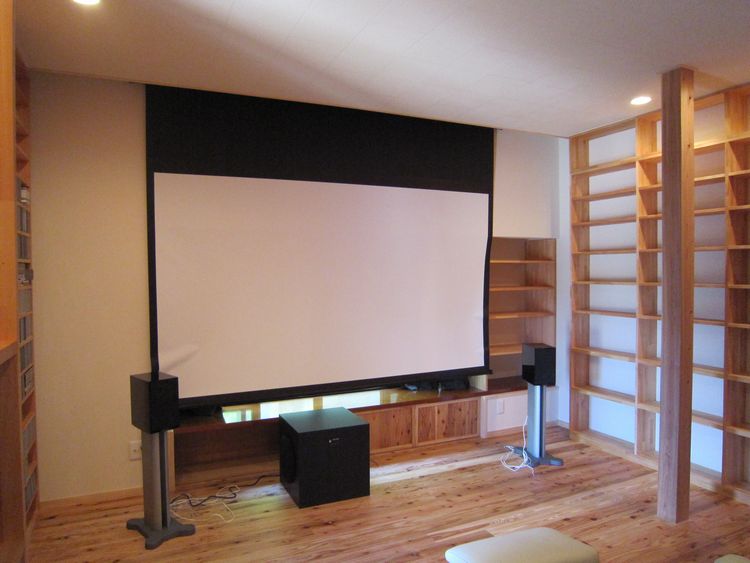 平屋中古物件を購入し、耐震改修を終えた後にLDK及び水廻りを増築しました。平屋の離れにある和室を趣味の映画視聴ができるように「シアタールーム」へリフォーム。音が漏れないように遮音シートを部屋一面に張り、電子機器の配線を考え床下に収納。壁は「珪藻土」で色は光をあまり反射しないように白っぽい「NATU」を使用。床は母屋と同じ「うずくりの床」です。自分だけの世界に入れる夢の空間を実現しました。‐ 大きなシアタースクリーンやスピーカーを設置し映画館同様の臨場感のある視聴ができます。