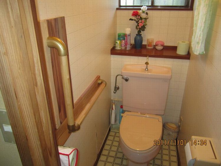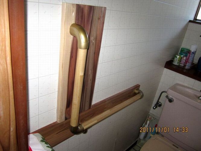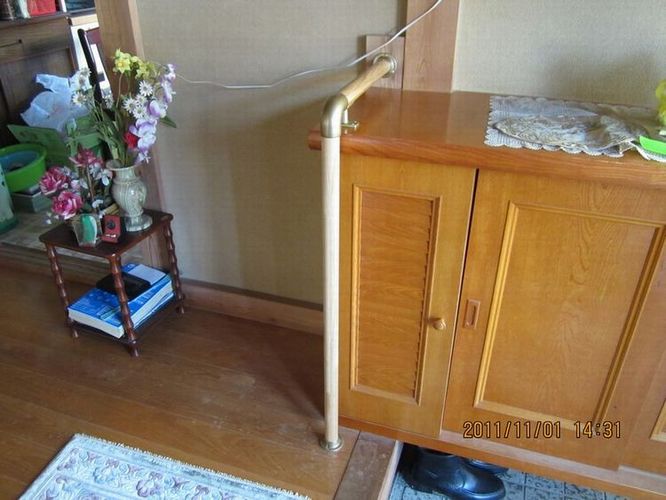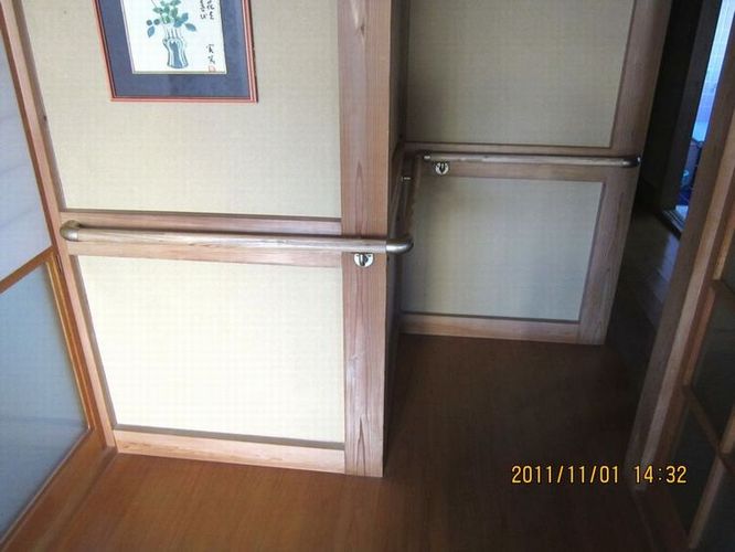 ご高齢の一人暮らしの方で最近になって足が悪くなり杖を突いての歩行でした。自室からトイレまでの距離があり杖での歩行だと時間がかかり不安定で転倒の危険性があります。時には這ってトイレに行くこともありました。今回は手摺を自室からトイレまでの距離とトイレの中、玄関の上りの三ヶ所に設置しました。