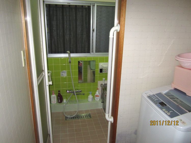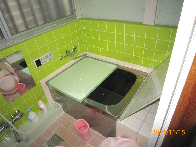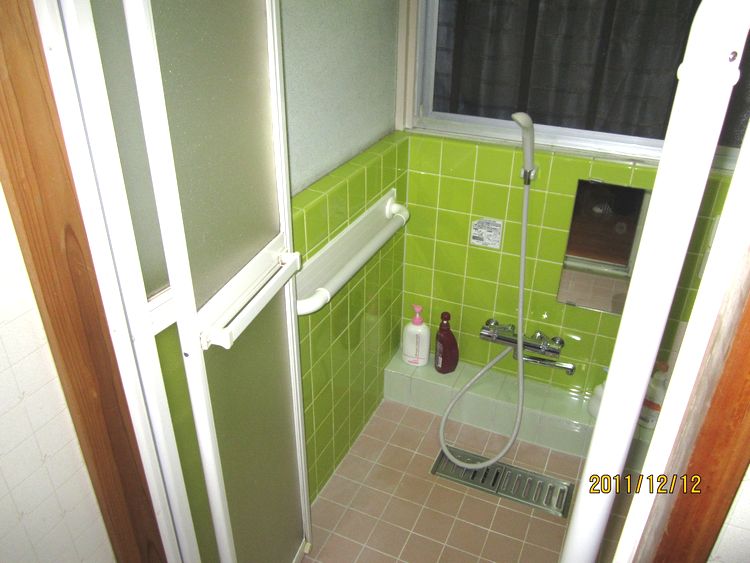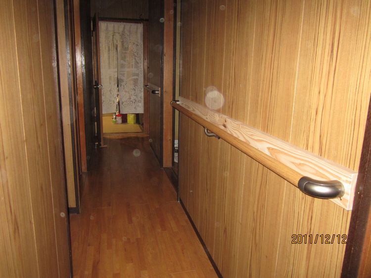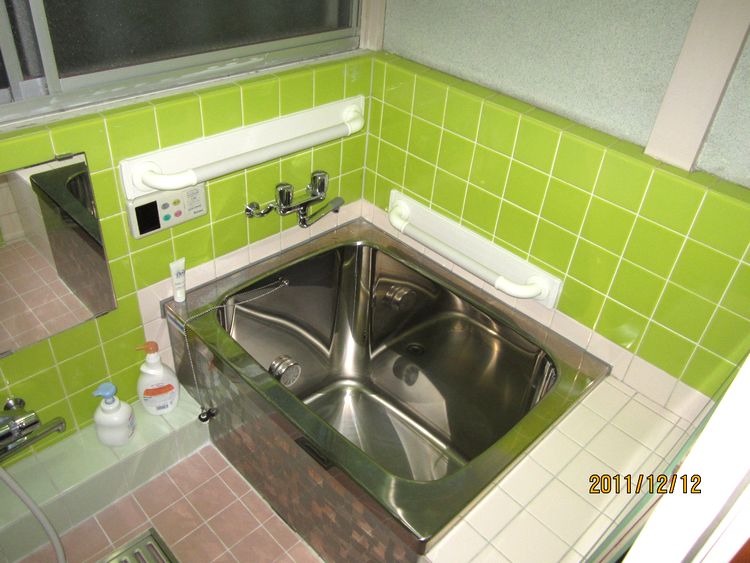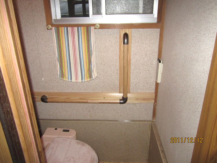 足が悪く、壁や物に掴まっていないと移動が困難。浴槽も底が深く出入りに掴む場所がない。改修箇所として、玄関前のアプローチ、玄関の上り、浴室、浴室入口、廊下、トイレに手摺りを設置しました。 - 浴槽は底が深く出入りが困難でしたが、手摺りを二面に設置した事によって一連の動作で浴槽への出入りが楽に。