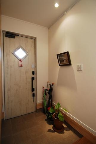 玄関内。デザイン性のある玄関ドアに白を基調として雰囲気のある落ち着いた感じが出ています。