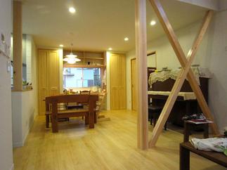 LDK。元々壁だったところを壁を撤去し柱と筋交を見せることにより広い空間を作っています。