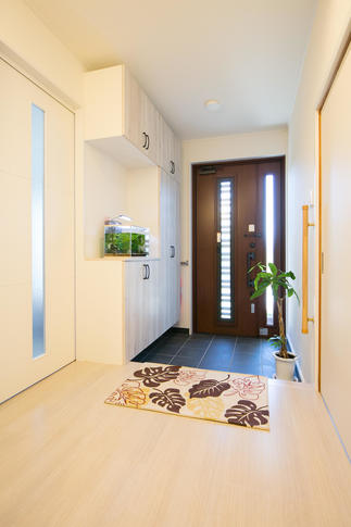 靴と傘が出しっぱなしの玄関は、昼間でも暗い感じがしました。 玄関ドアを高断熱ドアに交換。この玄関ドアは真ん中のガラス部分がスライドして開き、外の新鮮な空気を取り込み、玄関にこもる臭いを外へ出してくれます♪玄関収納もサイズUP。スッキリした明るい玄関になりました。さらに、手摺が着いたので同居するおばあちゃんも安心です。