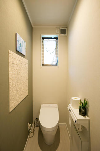 収納がほとんどなく、突っ張り棒の上に予備のトイレットペーパーを置いていました。タンクレストイレに交換したことで、奥行きが加わり広く感じられます。収納は自社大工さんが、お好みの位置に半分埋め込みで新設しました。トイレにエコカラットは必需品。脱臭効果もより高まります。