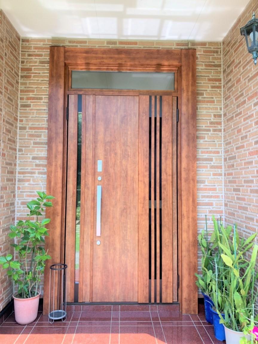 普段は愛犬を外で飼っているが、雨が降ったり夜寝るときは玄関内に入れるので通気の良い玄関ドアにしたい、というオーナー様のご希望でLIXILの「リシェント」に交換しました。採風タイプの「リシェント」なら、扉を閉めたまま新鮮な空気を室内に招き入れて、余分な熱気や湿気、気になるニオイは室外へ放出します。夏も爽快に、心地よい風が吹き抜ける玄関です!扉は閉めたまま風を採り込み、ドアの開け放しによる防犯上の不安や虫の心配もなくなりますし、わんちゃんの脱走の心配もありません。