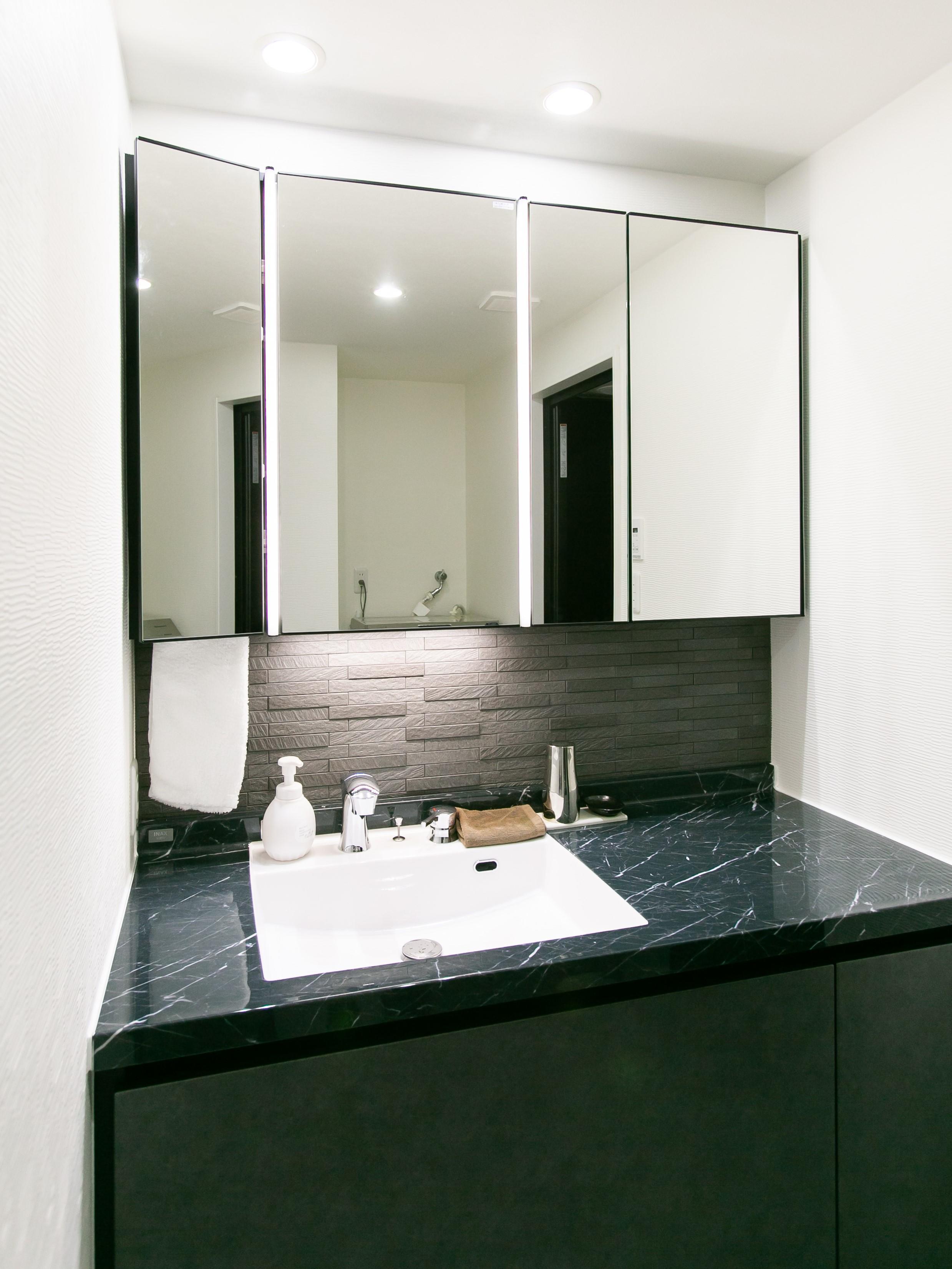 洗面化粧台はLIXILの『ルミシス』をご採用いただきました。さらなる高級感を追求し大理石の質感を再現した「ラピシアカウンター」を採用し、まるでホテルのドレッサーのような洗面化粧台になりました。 タテに配置したLED照明で顔に影を作らない「フェイスフルライト」は、化粧ムラや髭のそり残しのチェックにもおすすめ。手を差し出すだけで照明をオン・オフ・調光できる「タッチレススイッチ」、手を差し出すだけで吐水できる「タッチレス水栓(ナビッシュ)」は、非接触が求められる今にこそおすすめの機能です!ミラーキャビネットと洗面台の間には、『エコカラット』が貼ってあります。エコカラットは、心地いい湿度を保つ調湿機能、気になるにおいをすっきり脱臭、住まいの有害物質を低減、お手入れも水拭きでさっと簡単な壁材です。水まわりにはもちろん、結露やカビ、ダニの発生が気になるお部屋にもおすすめです。