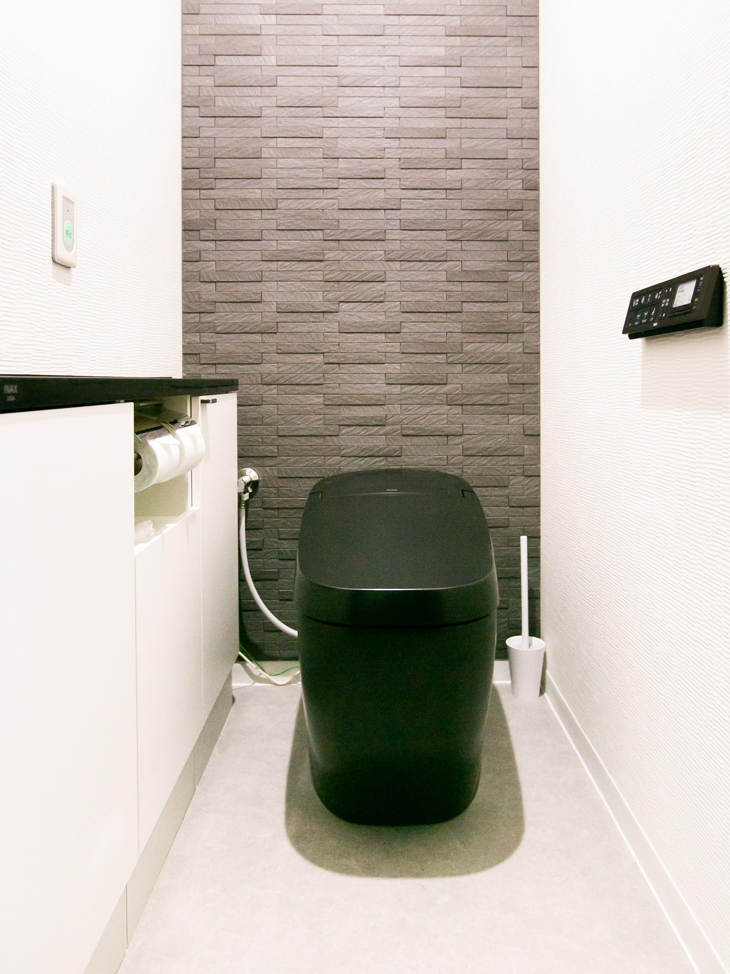 トイレはLIXILの『サティスG』をご採用いただきました。汚れも水あかも落とせる「アクアセラミック」、強力な水流が鉢内をしっかり洗浄する「パワーストリーム洗浄」、飛沫汚れや着水音を低減する「泡クッション」で、キレイが長続き。プラズマイオンクラスターがすみずみまで行き渡り除菌「鉢内除菌」、気流を発生・循環させて鉢内を脱臭する「エアシールド脱臭」、設定時間にプラズマクラスターイオンがトイレ空間にひろがりトイレの気になるにおいを消臭する「ルームリフレ」で、トイレの気になるニオイ対策もバッチリ!リモコン操作で便座が真上に上がり、便器とのすき間が簡単にお掃除できる「電動お掃除リフトアップ」、つぎ目をなくし便座裏の防汚処理でお掃除ラクラクな「キレイ便座」、凹凸がないので汚れもサッとひと拭きで落とせる「ラクふきフォルム」でお掃除もラクラク!さらに、トイレ背面には『エコカラット』を貼っているので、トイレの気になる臭いや湿気も軽減。壁面収納は扉付なのでいつでも清潔さを保ちながらお使いいただけます。