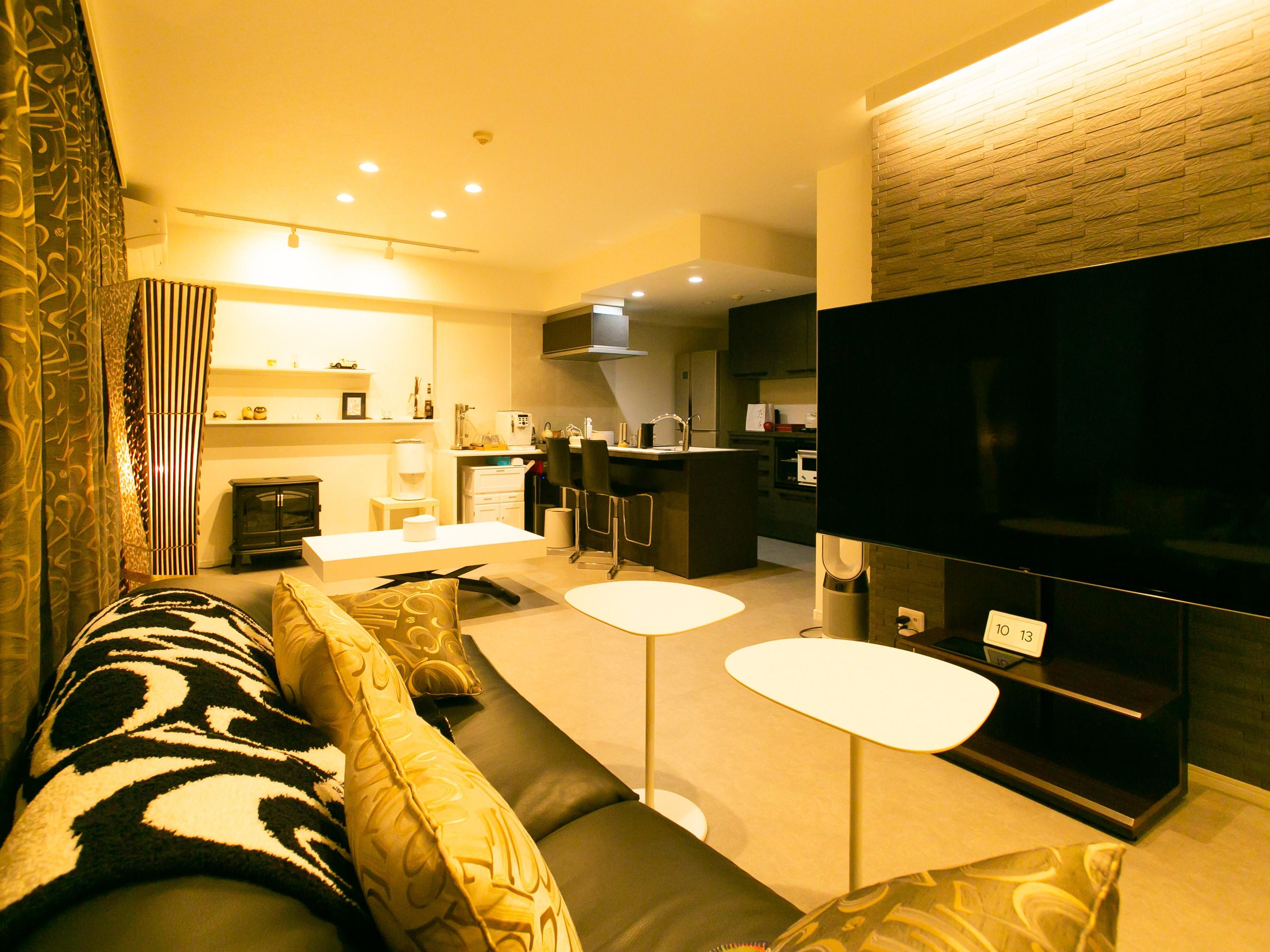 リビングと隣の畳スペース間の間仕切りを撤去して、一部屋に。照明器具はスマートスピーカーに対応し、音声でオン・オフができます。また、調光・調色も可能なので日中と夜で使い分けることができます。テレビ台の裏は『エコカラット』を貼りました。広々としたリビングに、快適でクリーンな空気があれば、居心地のいいリビングになりますね。