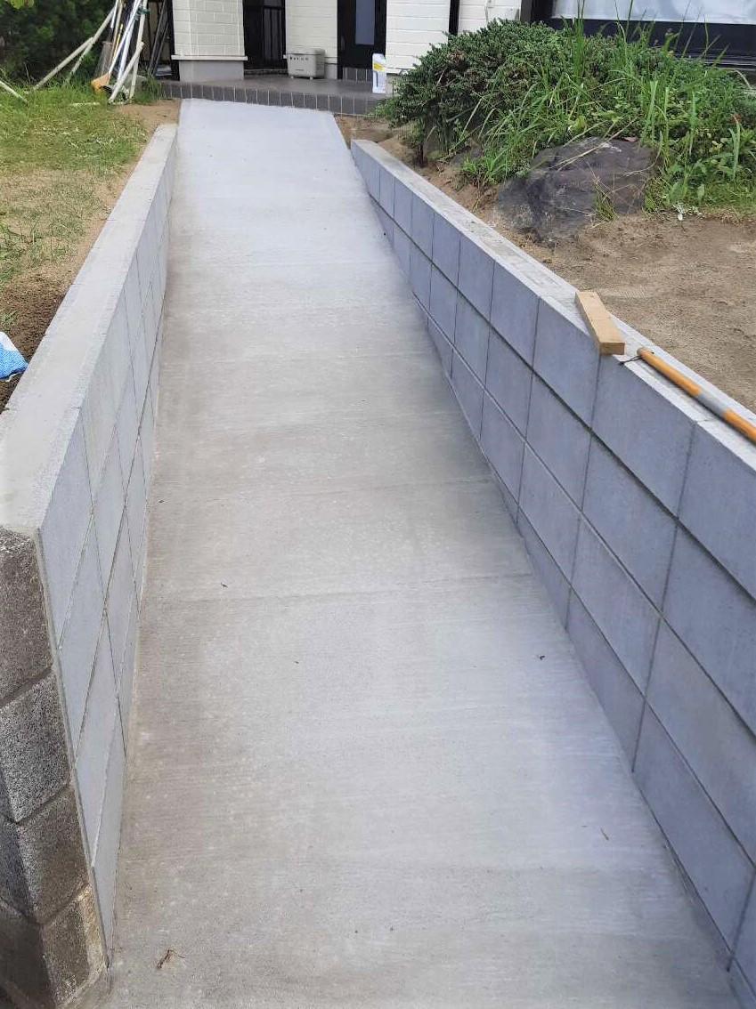 玄関アプローチの一部剥がれていたタイルを撤去、階段をやめてコンクリートを打ってスロープにしました。玄関アプローチのスロープ化は高齢者だけでなくベビーカーを使用する子育て世代にも、自転車や買い物カート・車いすを使用する方にも使いやすく、あらゆる世代にメリットがあります。