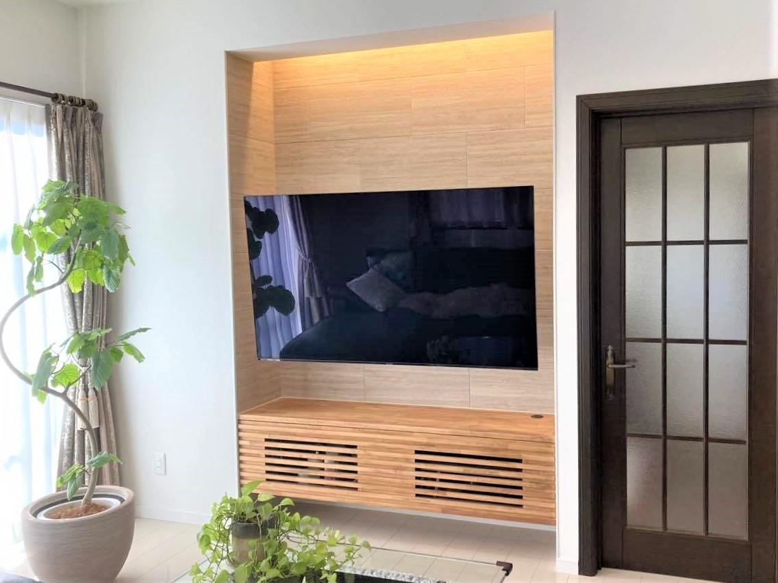 テレビボードは、自社社員大工にて造作させていただき取付ました。造作なら壁のくぼみに合わせて作ることができます。テレビ裏の壁3面にはLIXILの『エコカラットプラス』ネオトラバーチン(ベージュ)を貼付しました。リビングの生活臭や有害物質を吸収し低減。部屋の湿度を調節してくれるので快適な空間に。デザイン性も高くバリエーションが豊かで、お好みに合わせて空間を演出でき、リビングにアクセントや高級感が生まれますね。壁の上部には間接照明を取付けたので、エコカラットの凹凸が影になって味があります。
