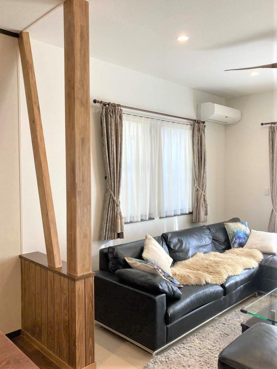 リビングとダイニングの間仕切りを撤去して、広々としたLDKを実現しました。構造的に抜けない柱と筋交は化粧板張り・塗装等を施しインテリアの一部として。リビングは、腰壁を撤去しクロスを張り替えました。床の張り替えも行い、フローリング材として東洋テックスの『ダイヤモンドフロアーR 7100』ホワイトを使用しています。