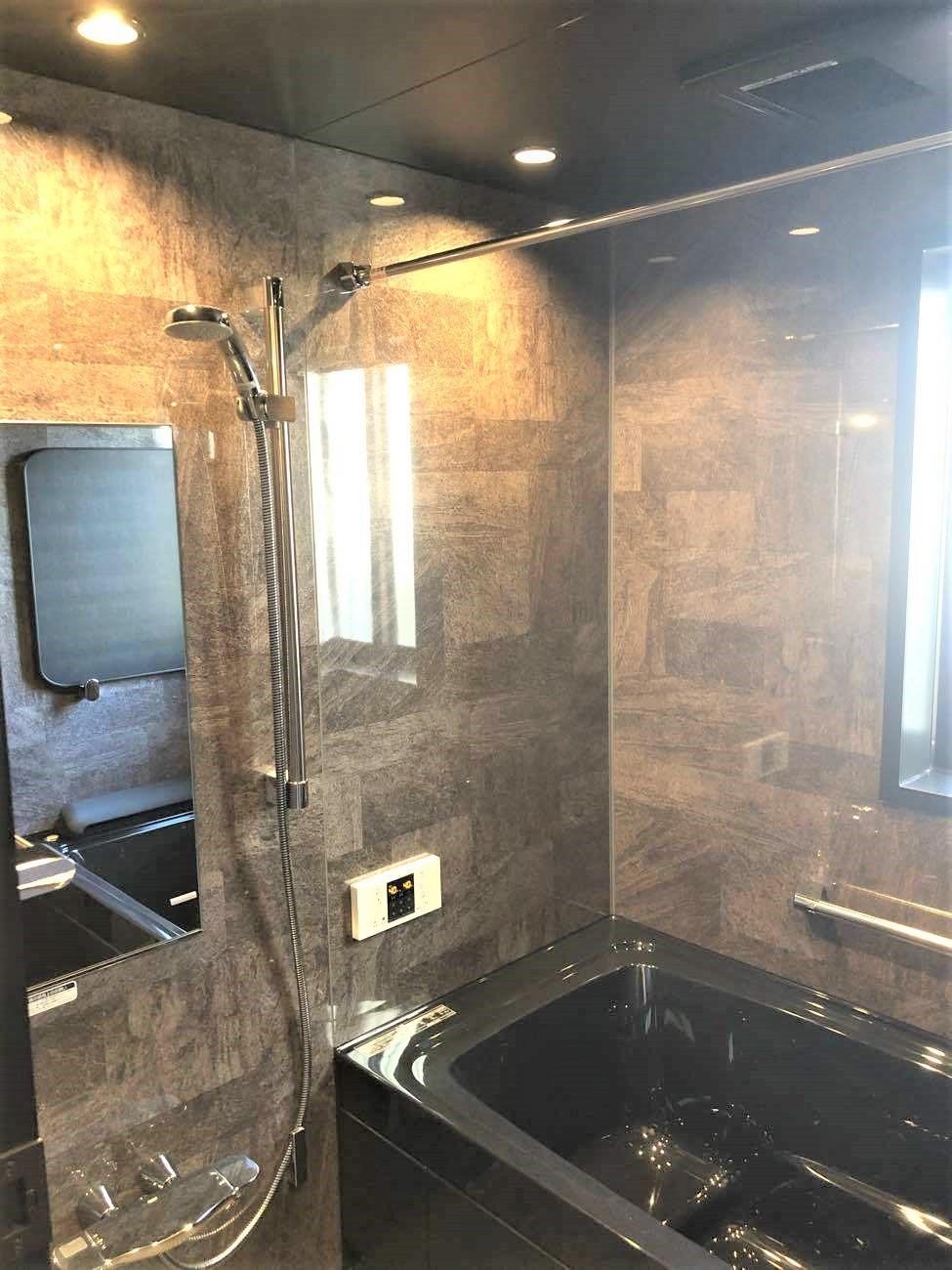浴室はLIXILの『スパージュ』をご採用いただきました。スパージュでおすすめなのは、やはり「アクアフィール〔肩湯〕」!全身浴でも、半身浴でも心からリラックスできる、お湯が織りなすベールのような新感覚の肩湯で、新しい入浴スタイルが楽しめます♪浴室に入った時に足裏の冷たさが感じにくくなる「キレイサーモフロア」、保温組フタと浴槽保温材によるダブル保温でお湯が冷めにくい「サーモバスS」、そして今回キャンペーンでプレゼントさせていただいた「換気乾燥暖房機」で暖かく快適にご使用いただけます。スパージュの浴槽に用いられている人造大理石「グランザ」は、LIXIL最高級の滑らかさを誇るアクリル鏡面仕上げの透明層と柔らかく光を通す半透明層により、深みと奥行きのある輝きを放ちます。キラキラと輝くパールブラックの浴槽と、天然石を再現したグレーの壁パネル、モザイクダークグレーの床とモノトーンで統一し、上品で落ち着いた雰囲気の浴室になりました。ご自宅にいながら、まるで高級ホテルのバスルームに入っているような体験ができます。